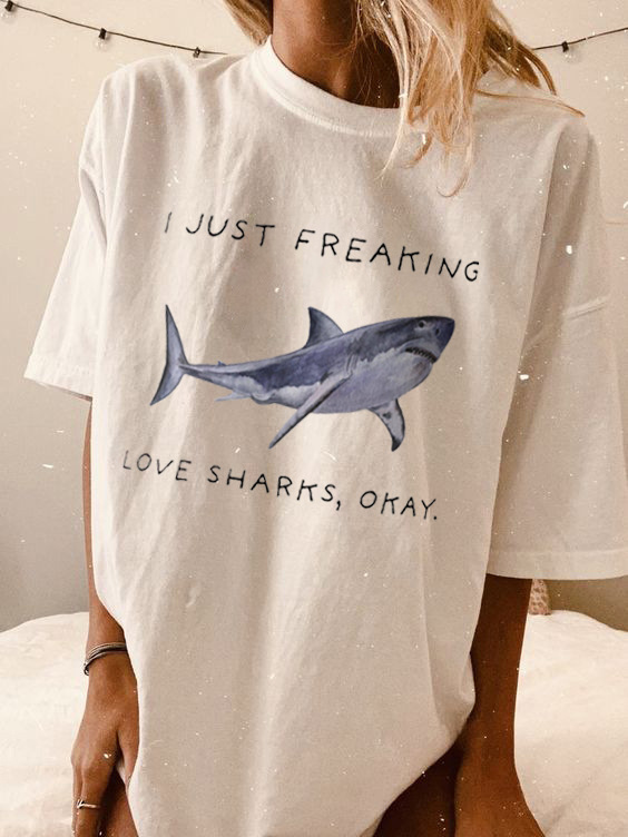 Women's I Just Freaking Love Sharks Okay Print Loose T-Shirt