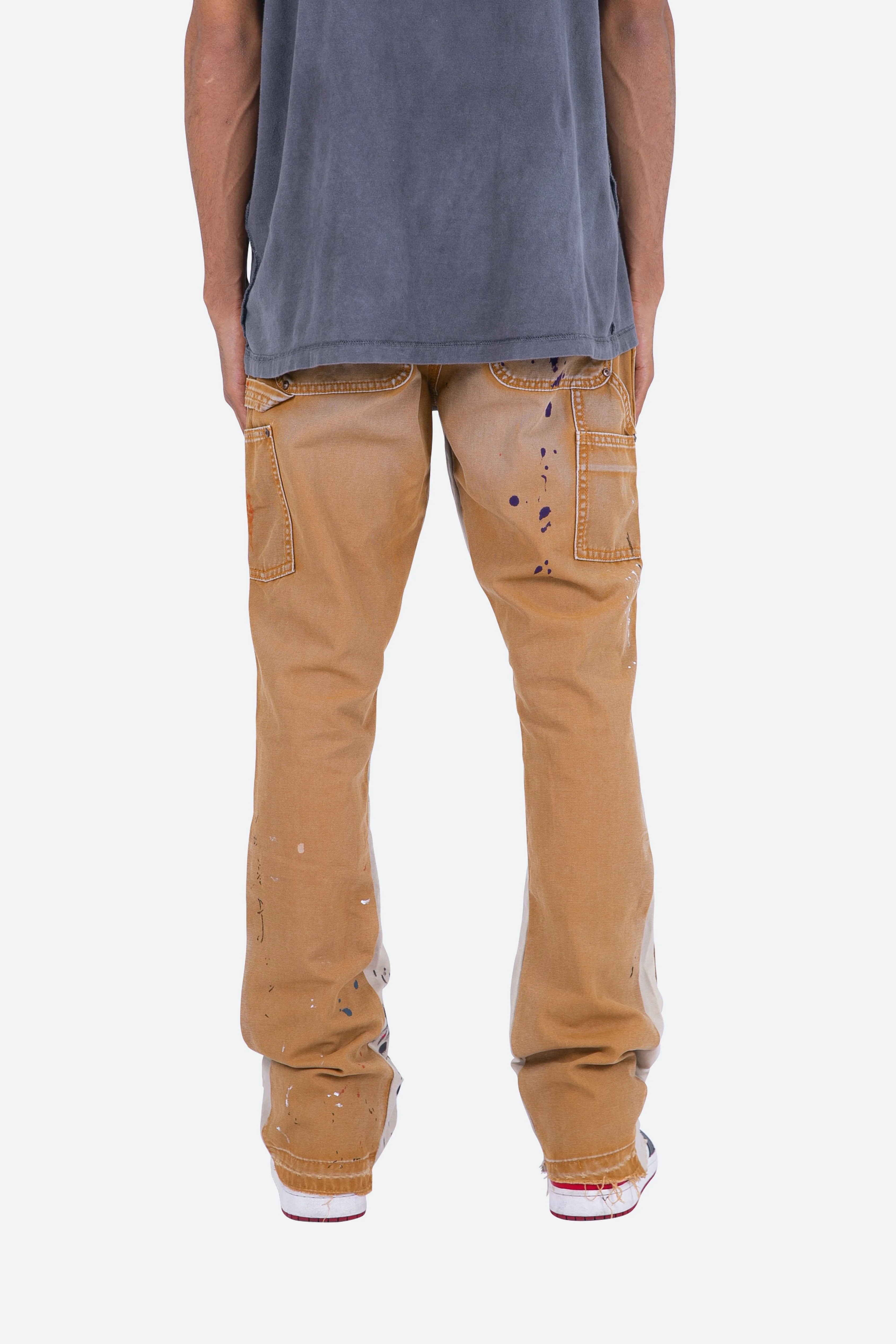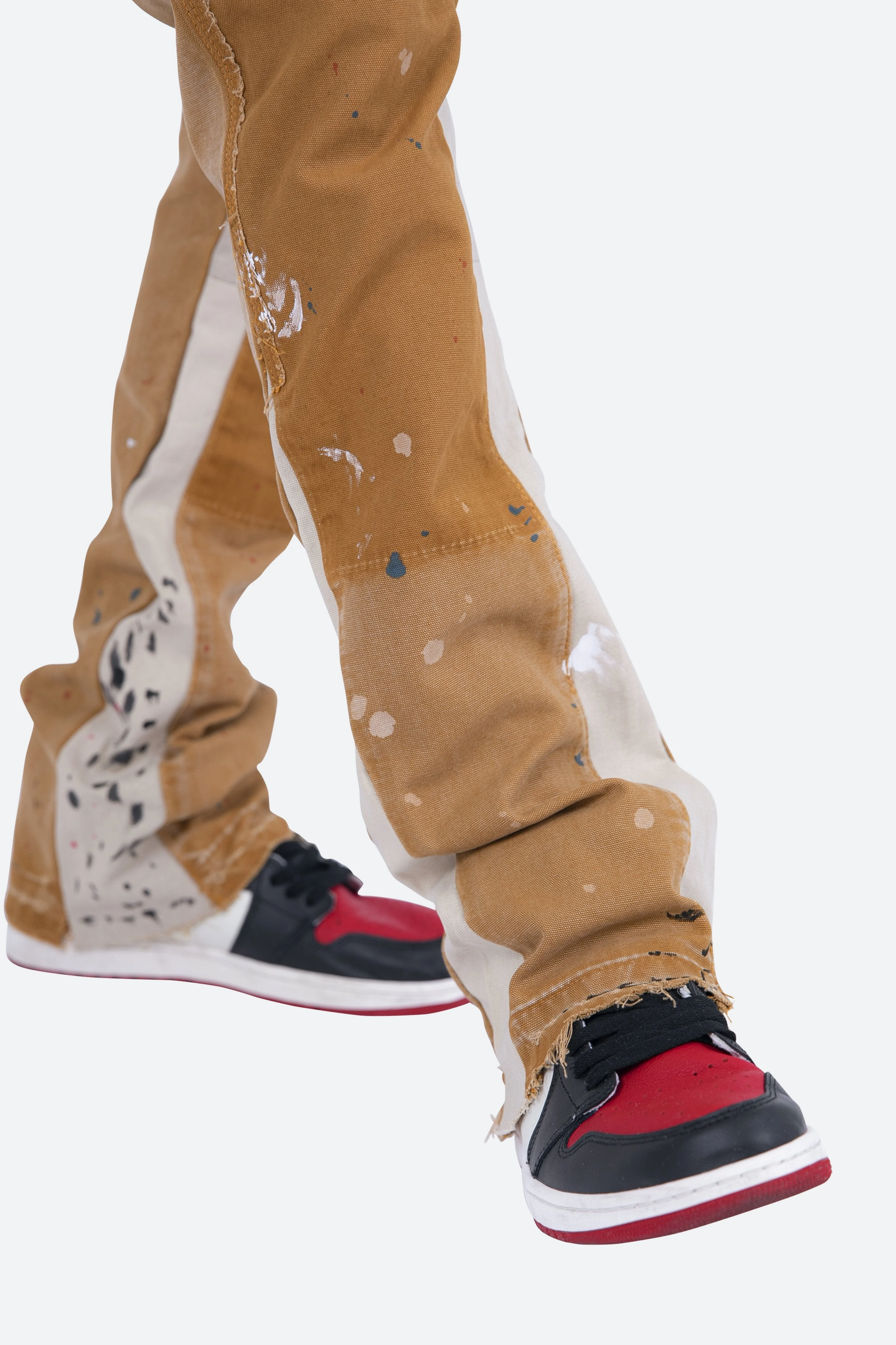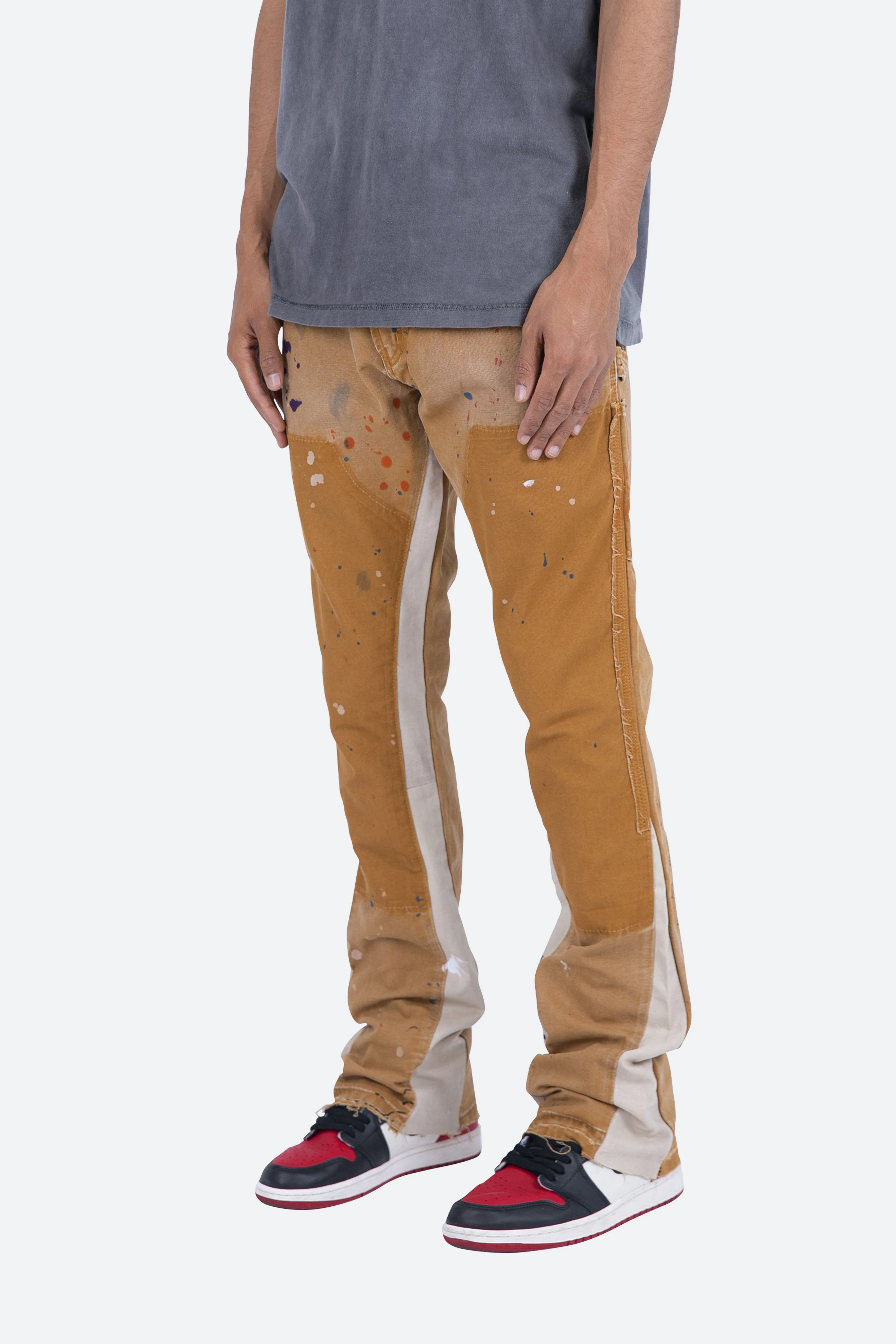 the B243 Flare Denim?are designed with our new B fit, which is slim through the thigh and features a slight flare at the leg opening?and is constructed from washed?brown?duck twill, work pants panelling removed after wash for contrasting wash area, panelling at the inseam and outseam for a slight flare, paint splatter throughout, and finished with a?deconstructed hem.