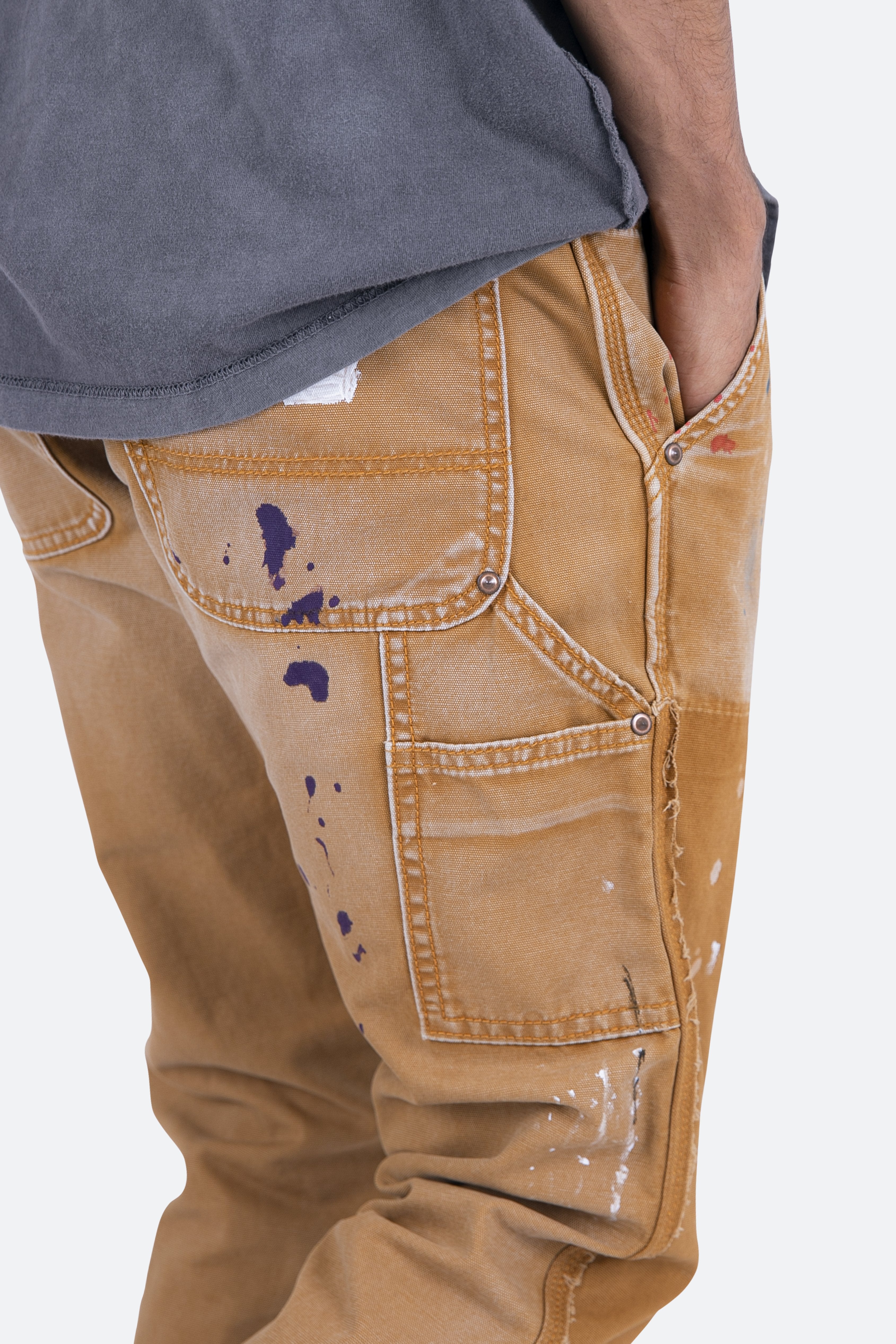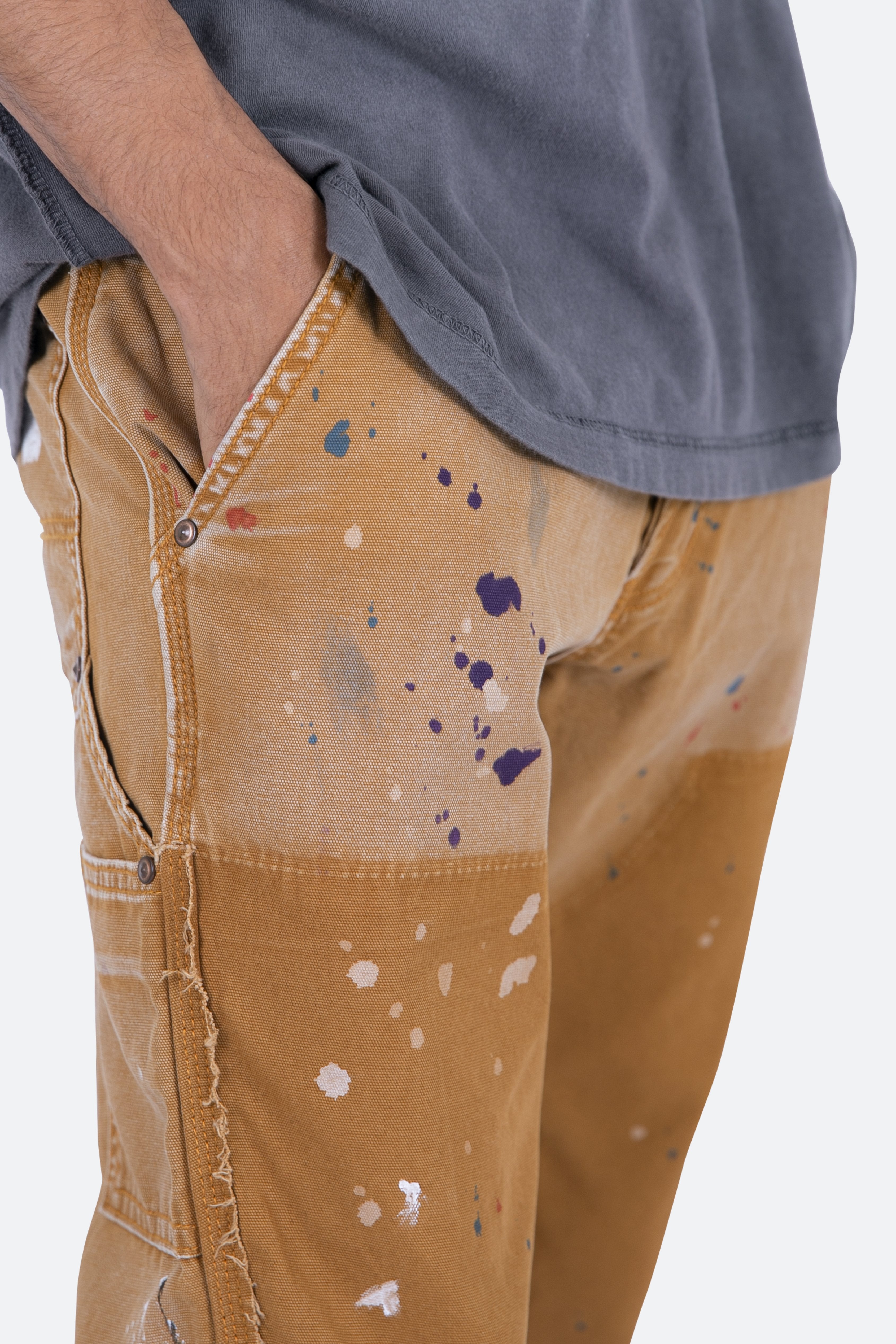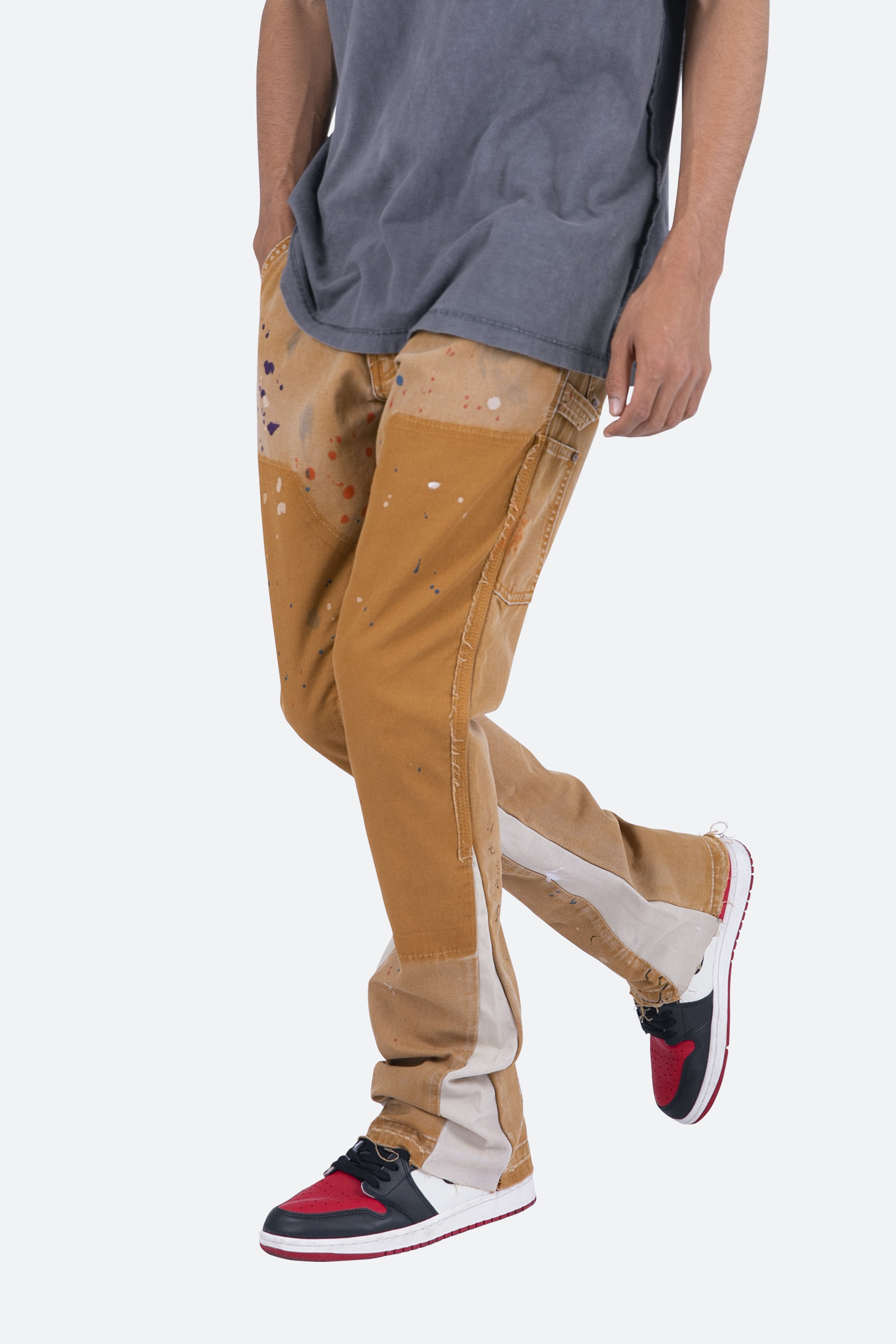 the B243 Flare Denim?are designed with our new B fit, which is slim through the thigh and features a slight flare at the leg opening?and is constructed from washed?brown?duck twill, work pants panelling removed after wash for contrasting wash area, panelling at the inseam and outseam for a slight flare, paint splatter throughout, and finished with a?deconstructed hem.