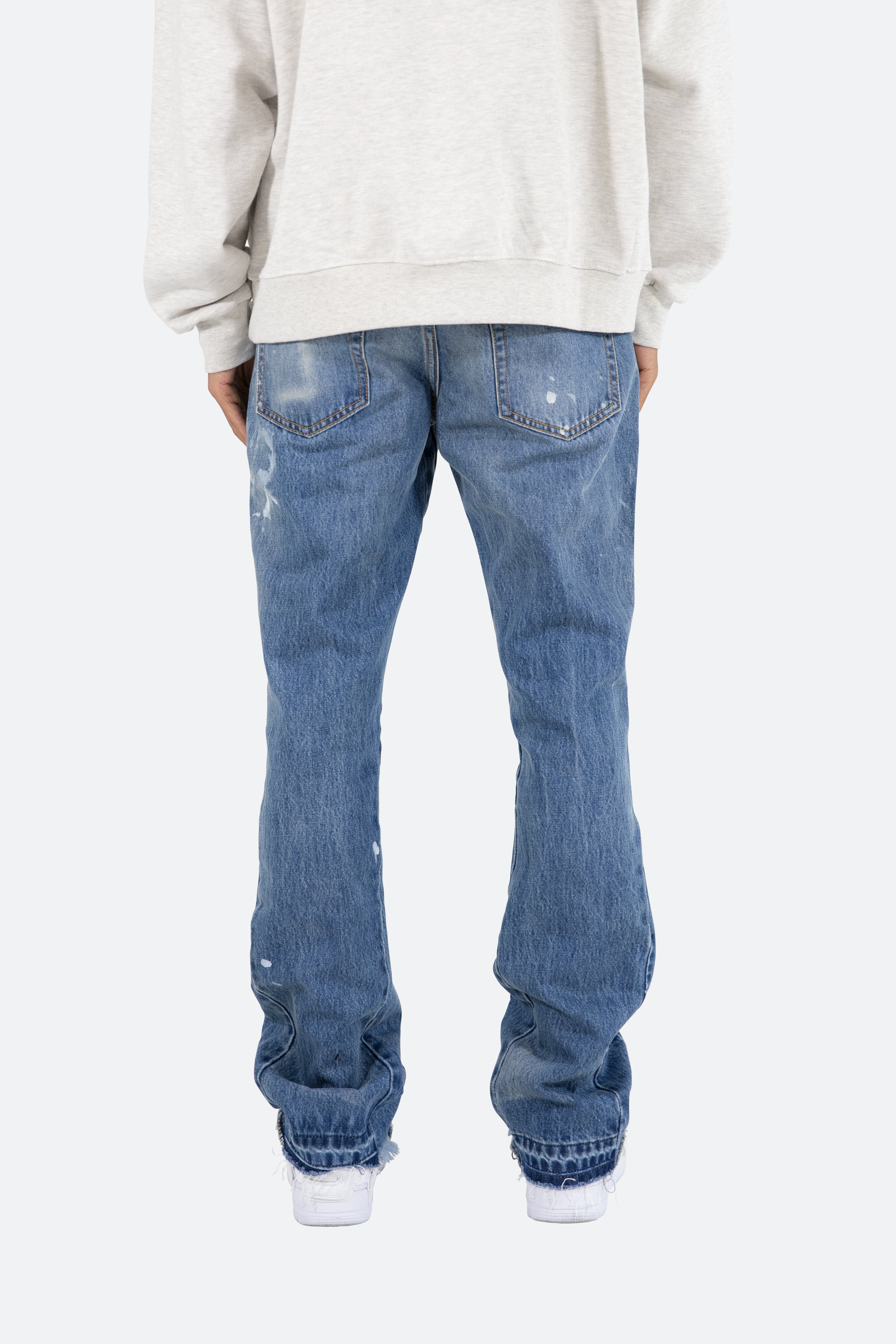 the B400 Flare Denim?are designed with our new B fit, which is slim through the thigh and features a slight flare at the leg opening?and is constructed from medium washed blue denim, panelling at the inseam and outseam from?contrasting denim?for a slight flare, paint details, and finished with a?deconstructed hem.