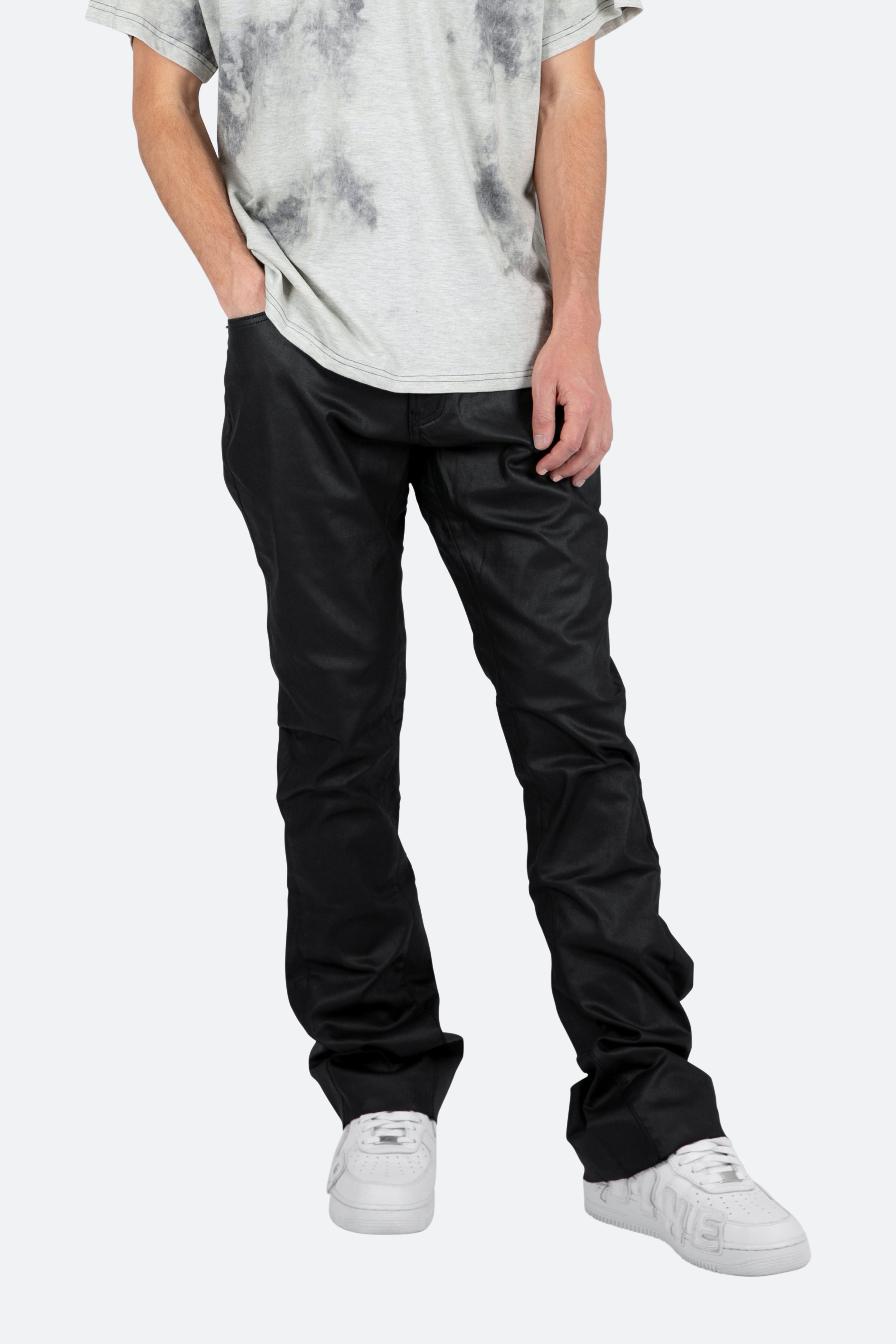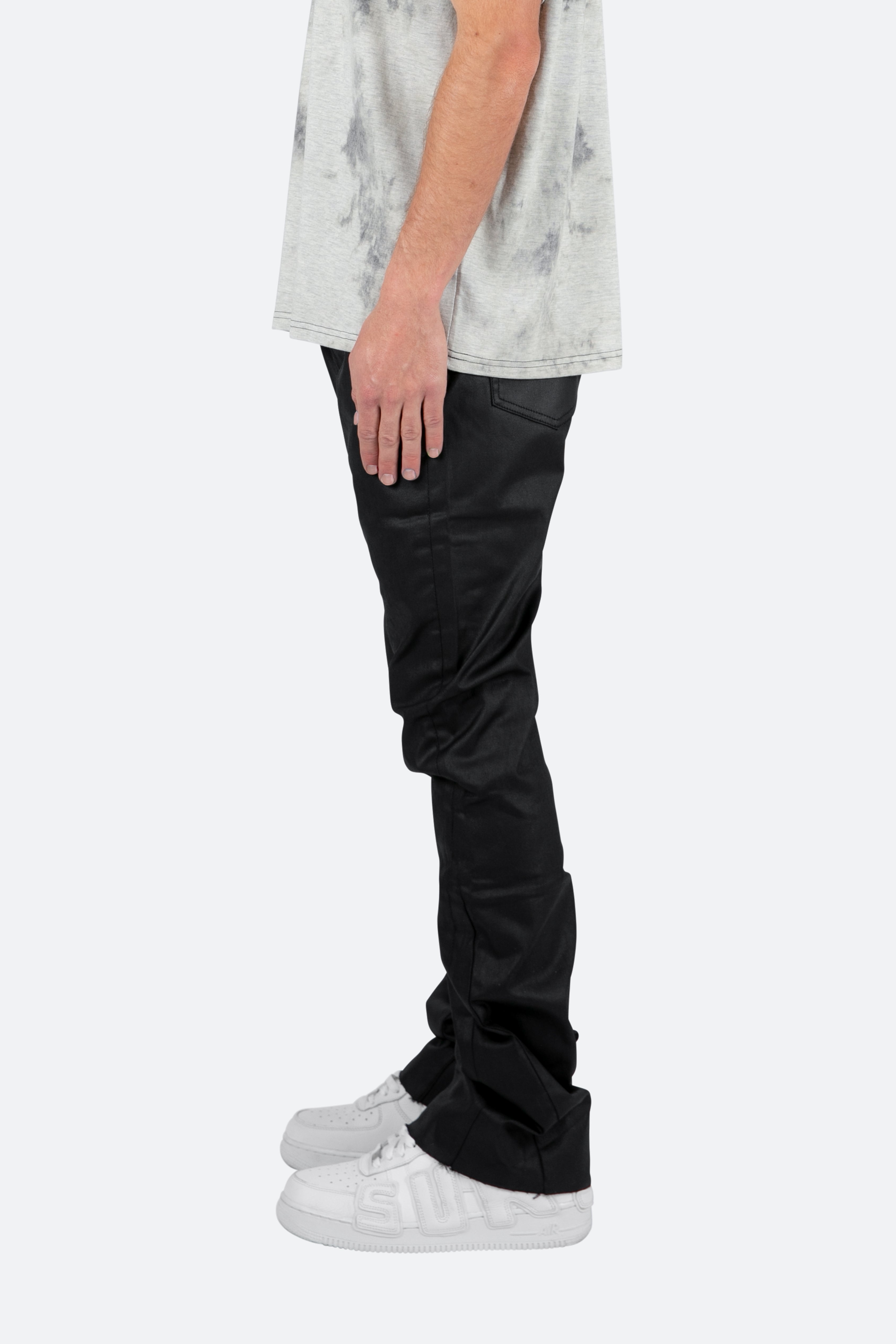 the B447 Waxed Flare Denim?are designed with our new B fit, which is slim through the thigh and features a slight flare at the leg opening?and is constructed from waxed black denim, panelling at the inseam and outseam from self fabric?for a slight flare, and finished with a?deconstructed hem.