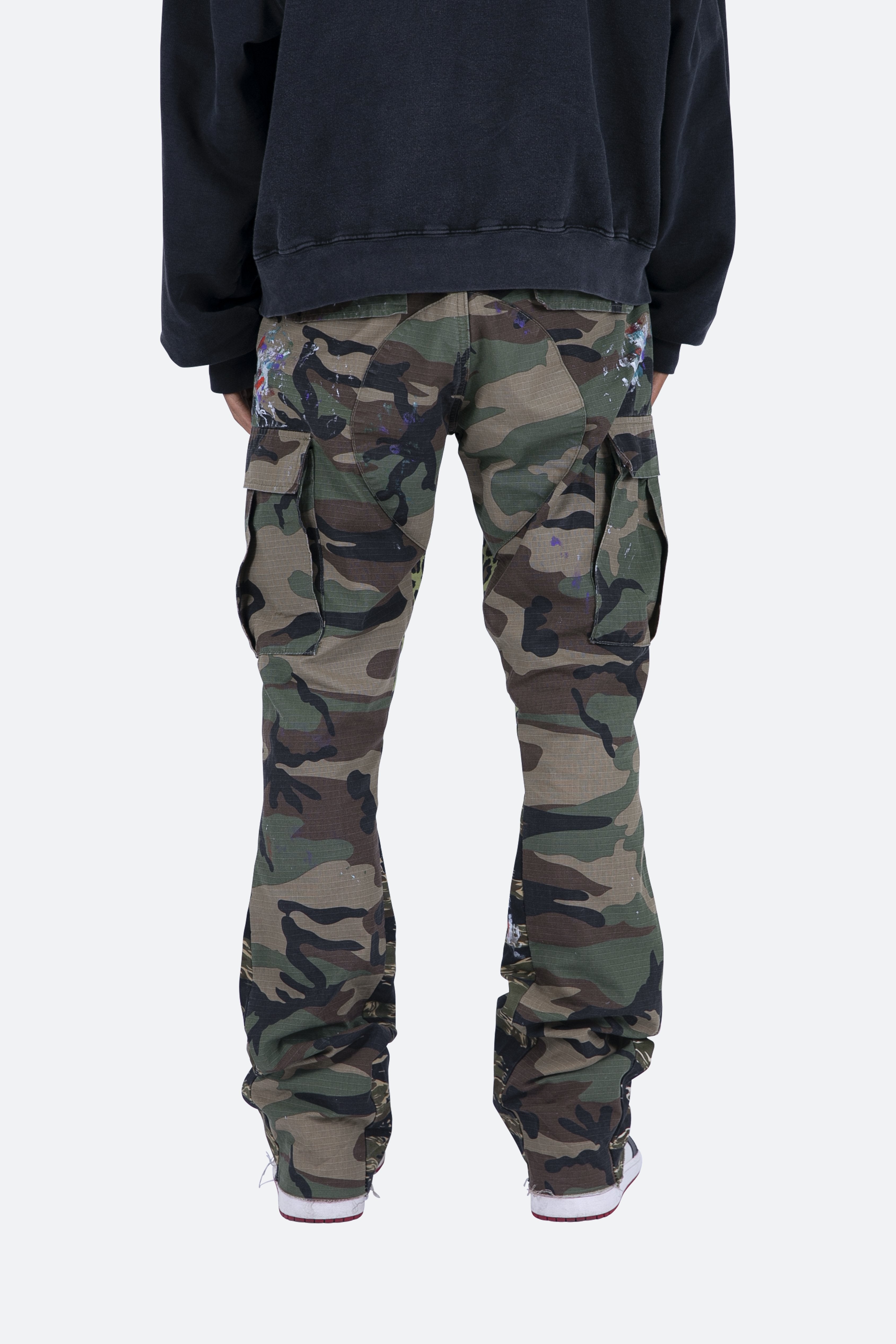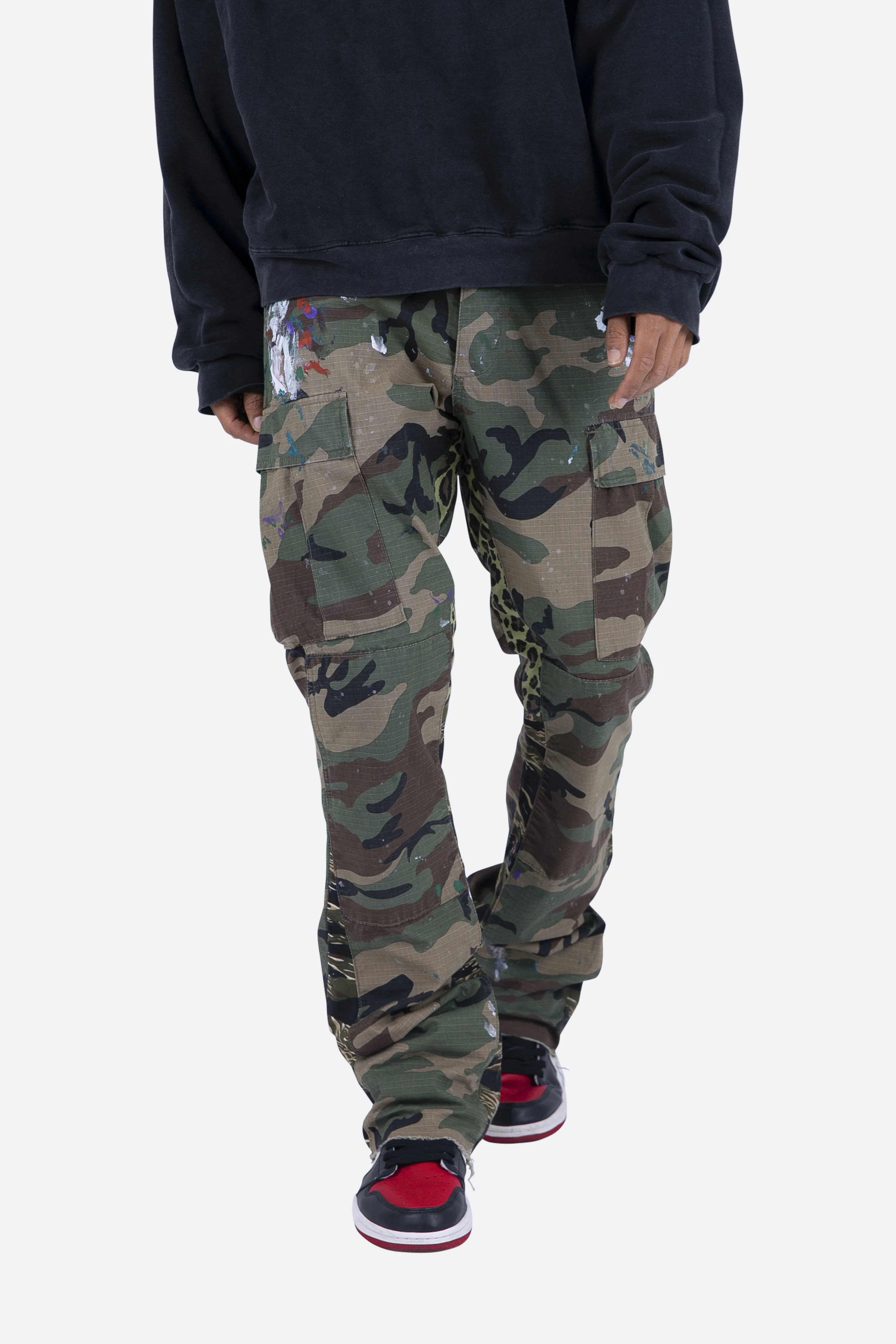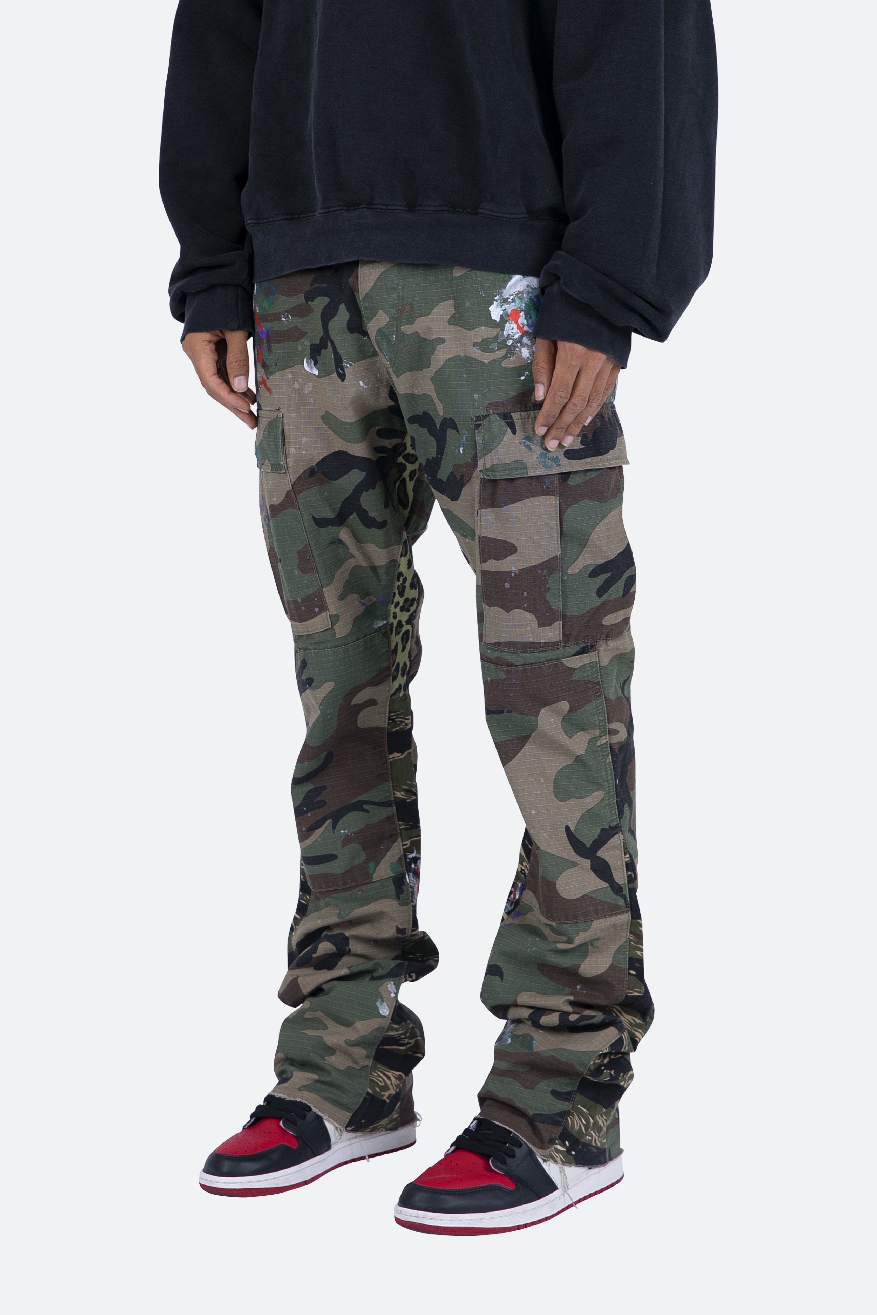 the Contrast Bootcut Cargo Pants?are designed with our new B fit, which is slim through the thigh and features a slight flare at the leg opening?and is constructed from?washed camo twill, with a vintage wash and paint splatter, and finished with a contrasting leopard and tiger camo panelling.