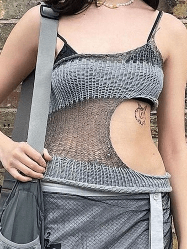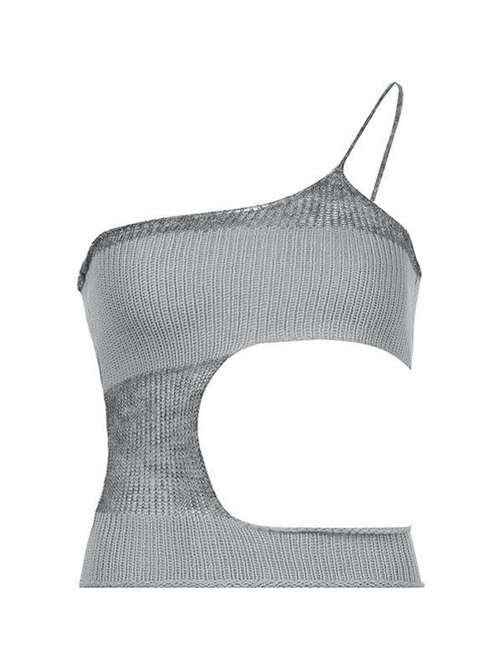 Description: Made from crochet knit fabric, these cami tops feature one shoulder design, with an extra cutout hole at one side.