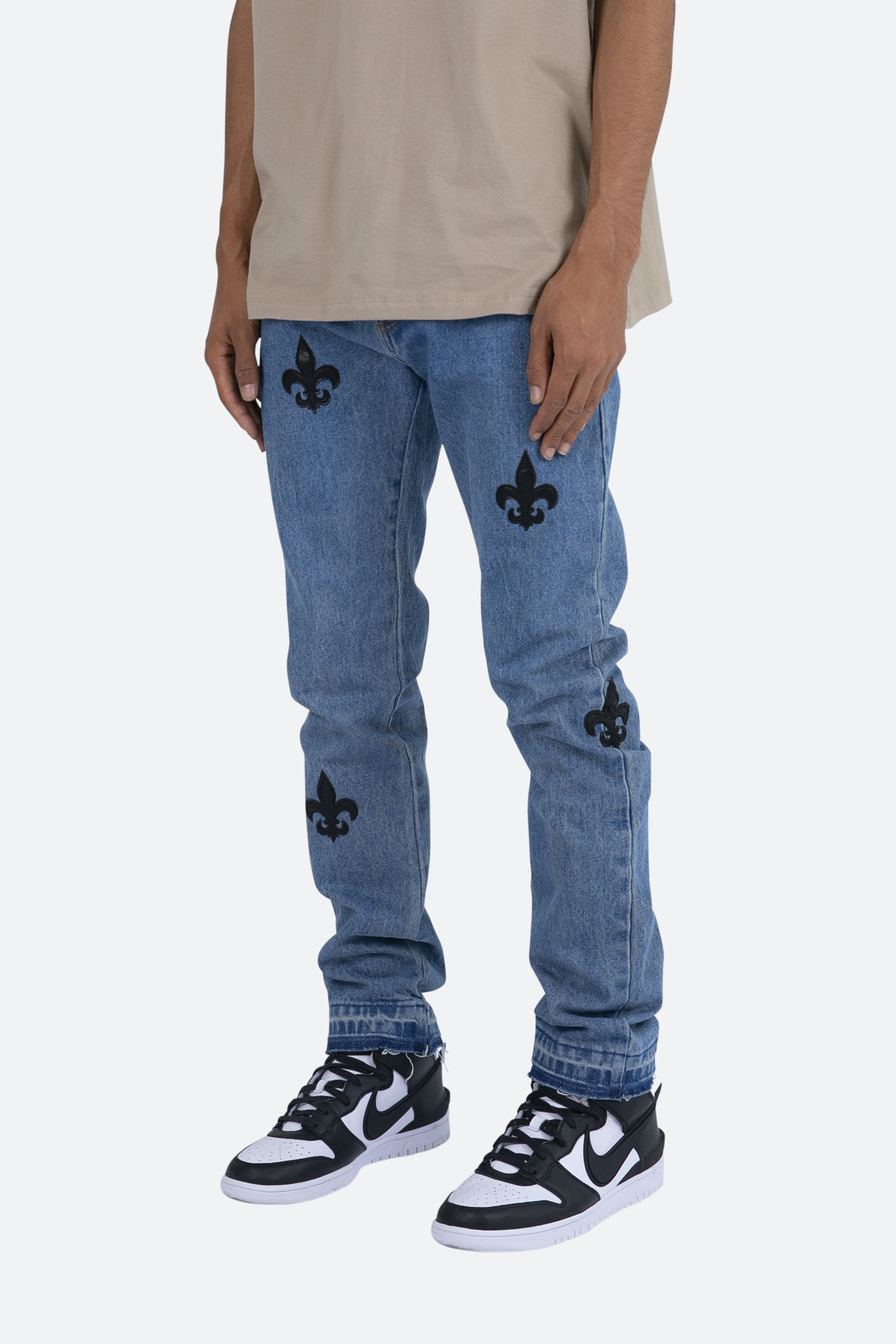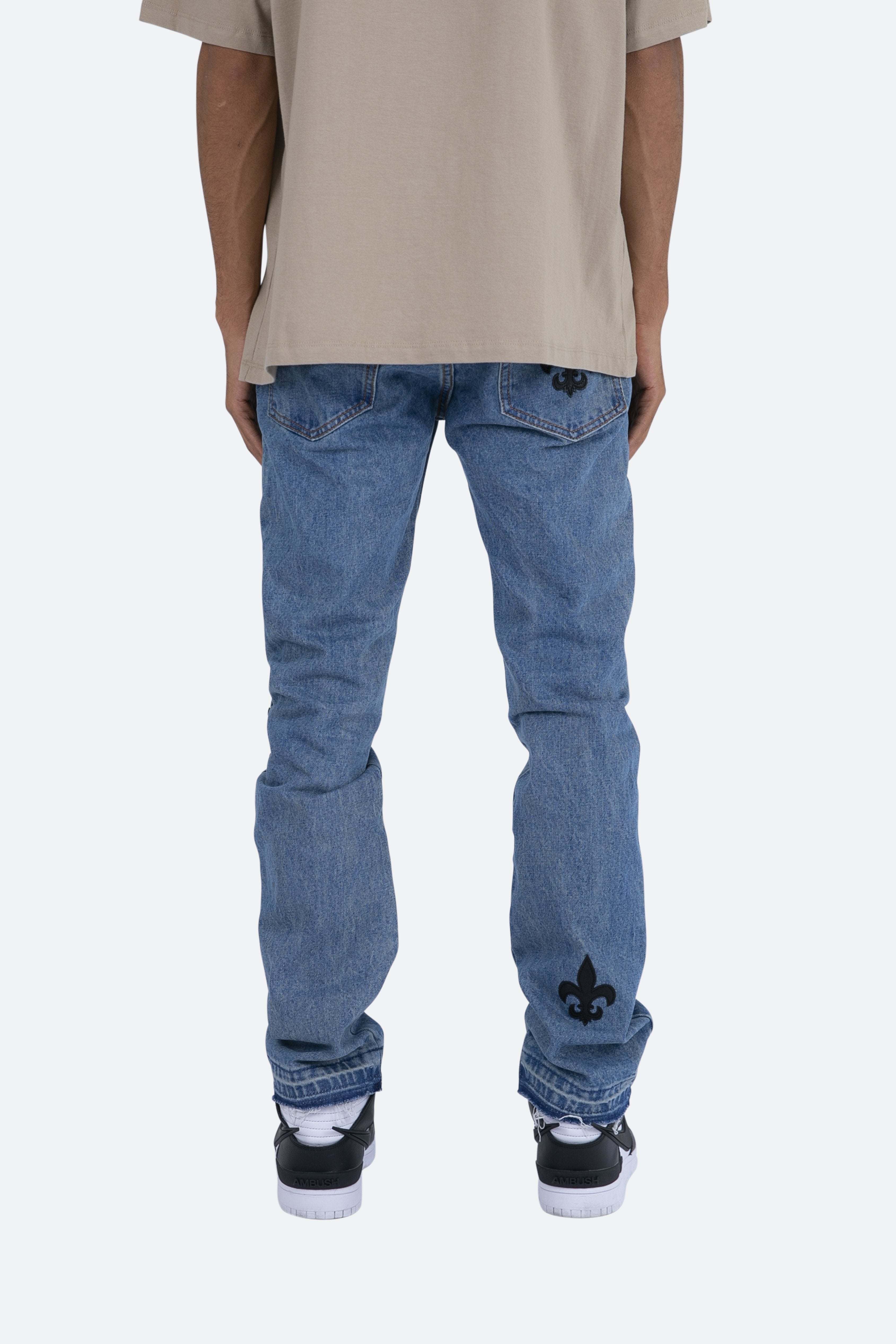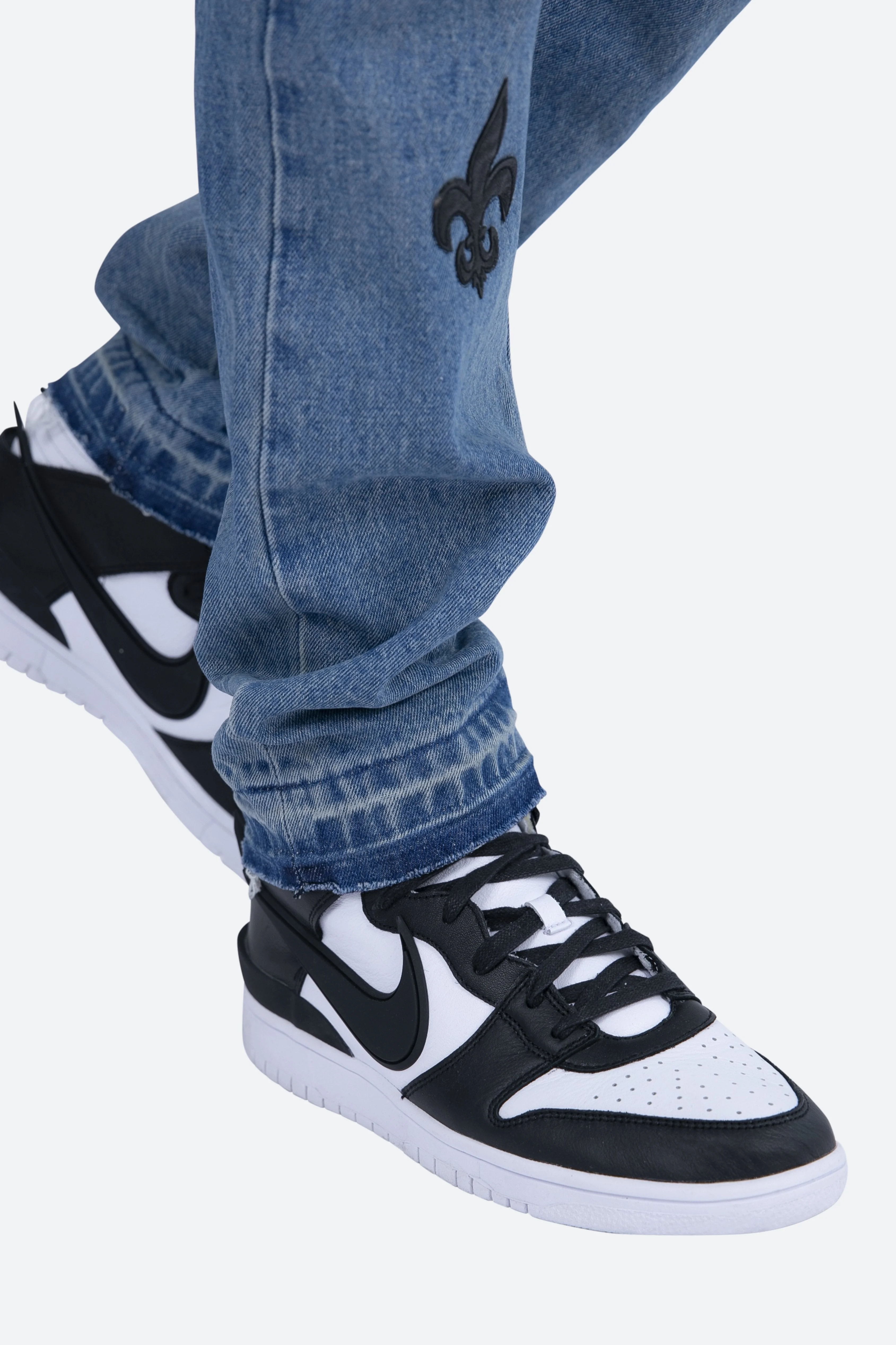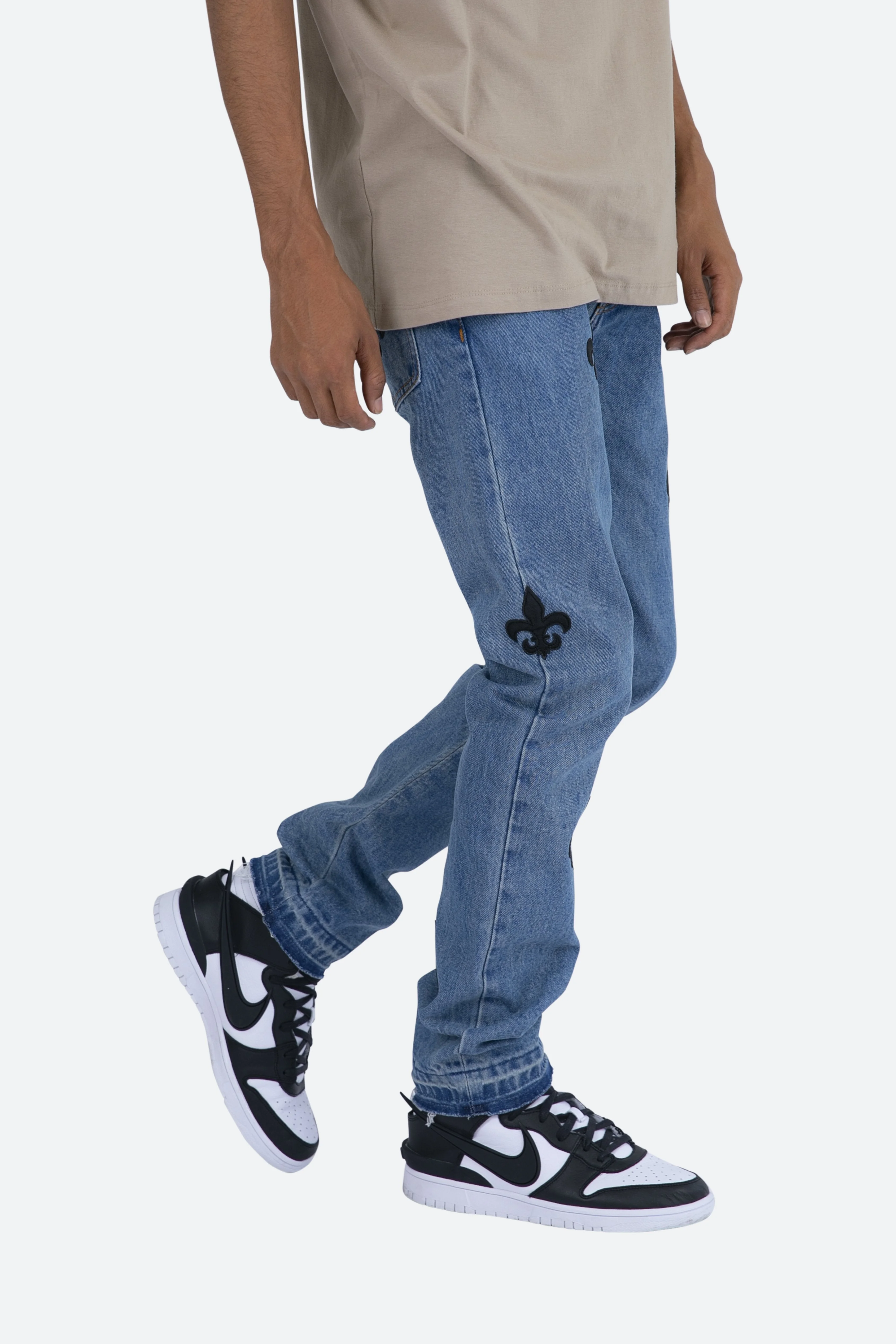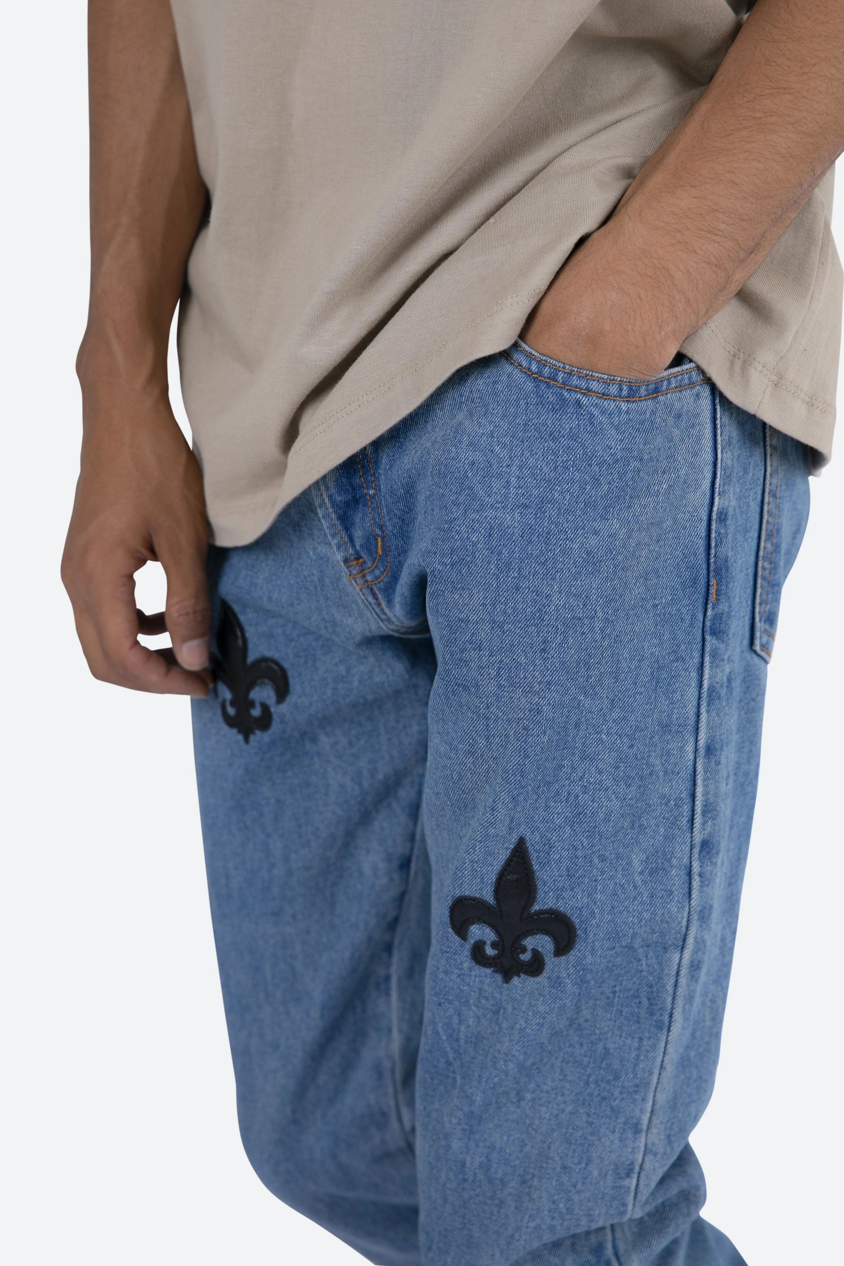 the D112?Fleur?Denim is designed with our new D fit which is relaxed throughout with an extended inseam for stacking?and?features?a warm, vintage wash,?with?whiskering and sanding throughout, and finished with poly-leather?fleur de lis appliques throughout.