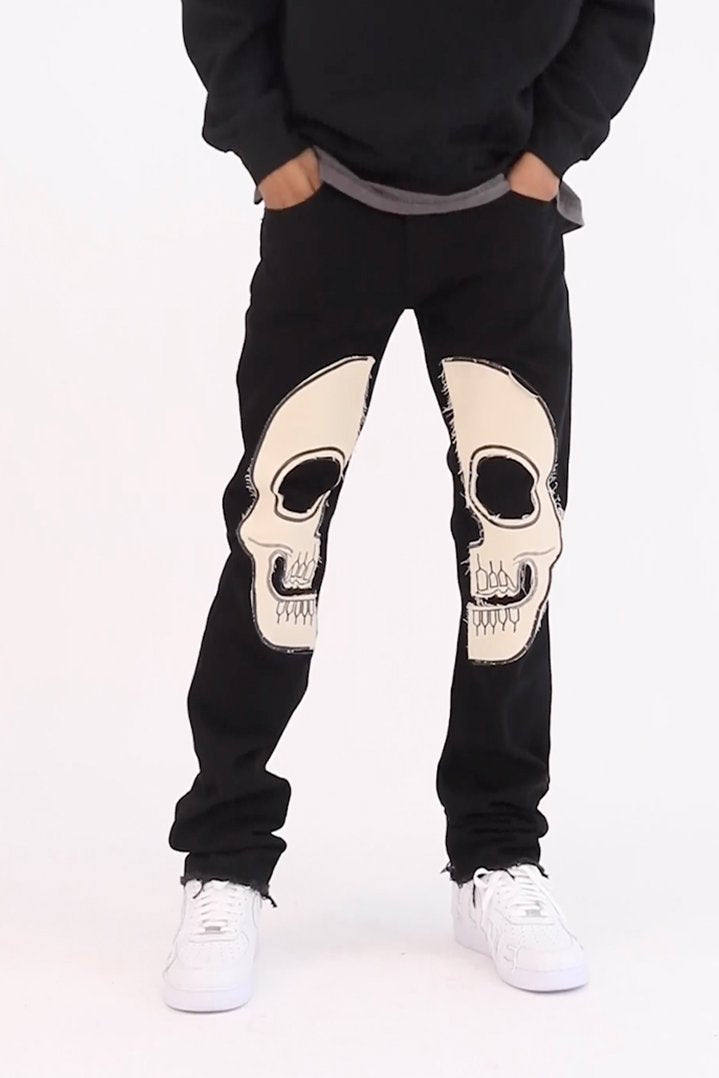 the D181 Denim is designed with our new D fit which is relaxed throughout with an extended inseam for stacking?and?features sewn-on skeleton artwork in canvas on both legs and is constructed from black denim with a raw leg opening.