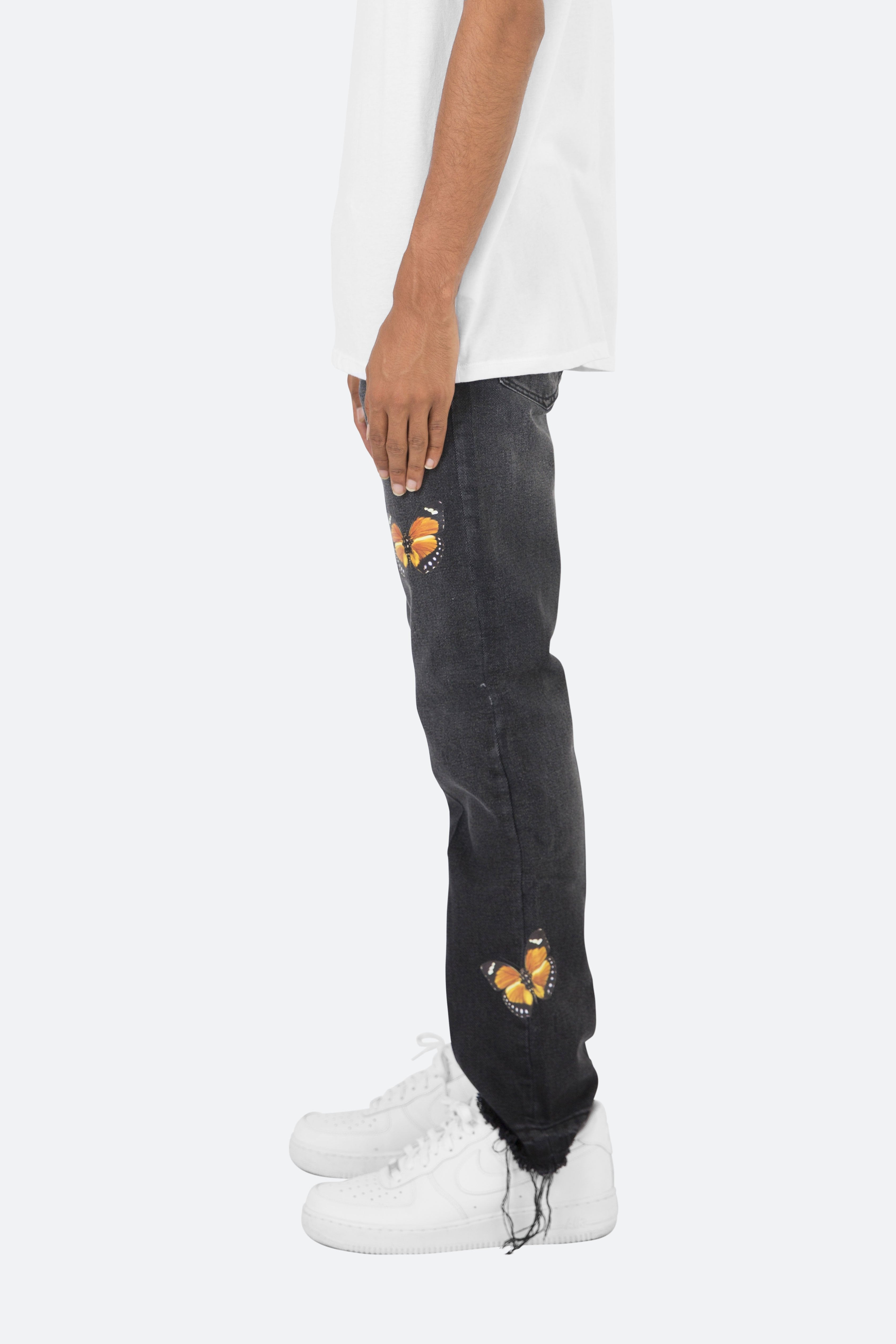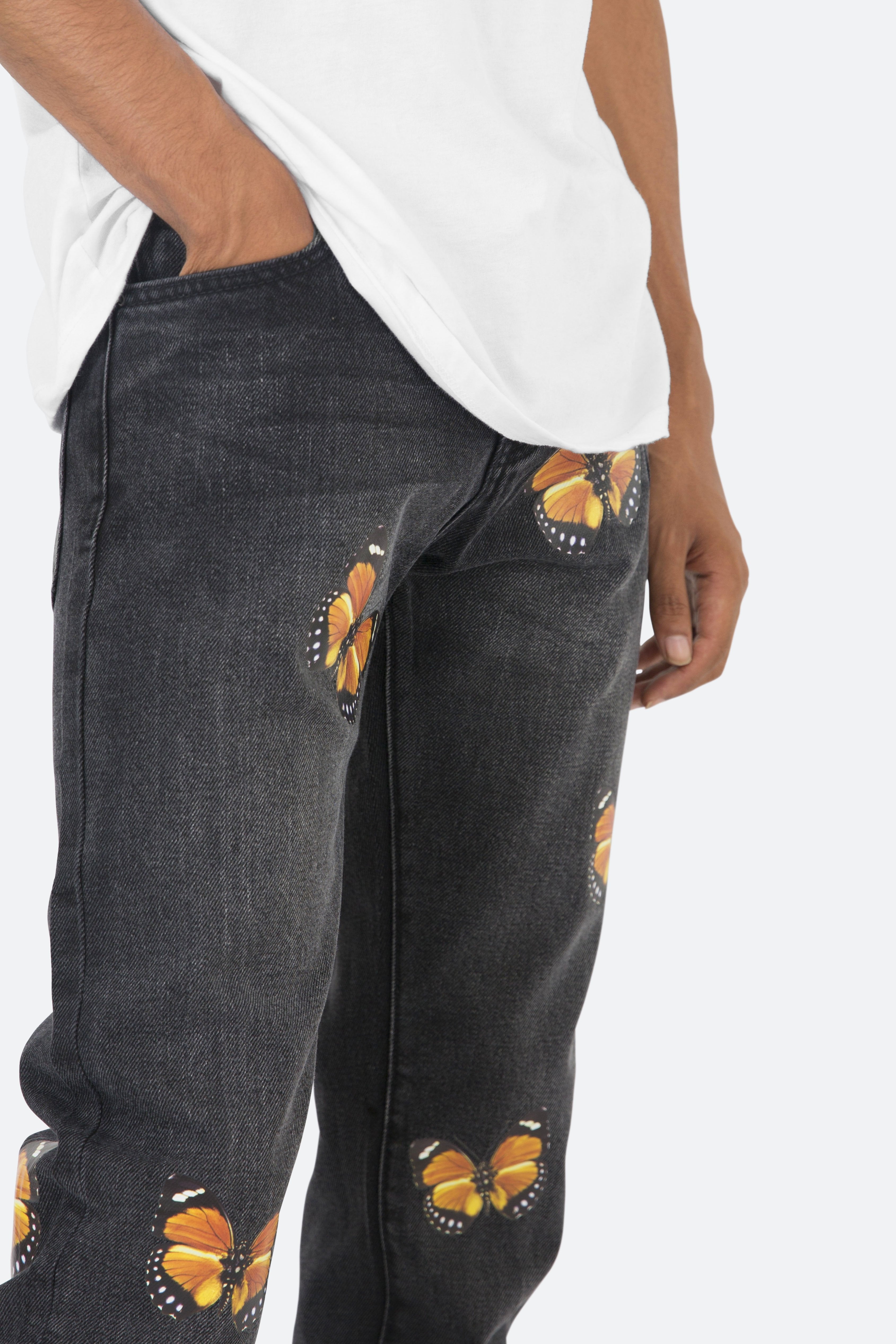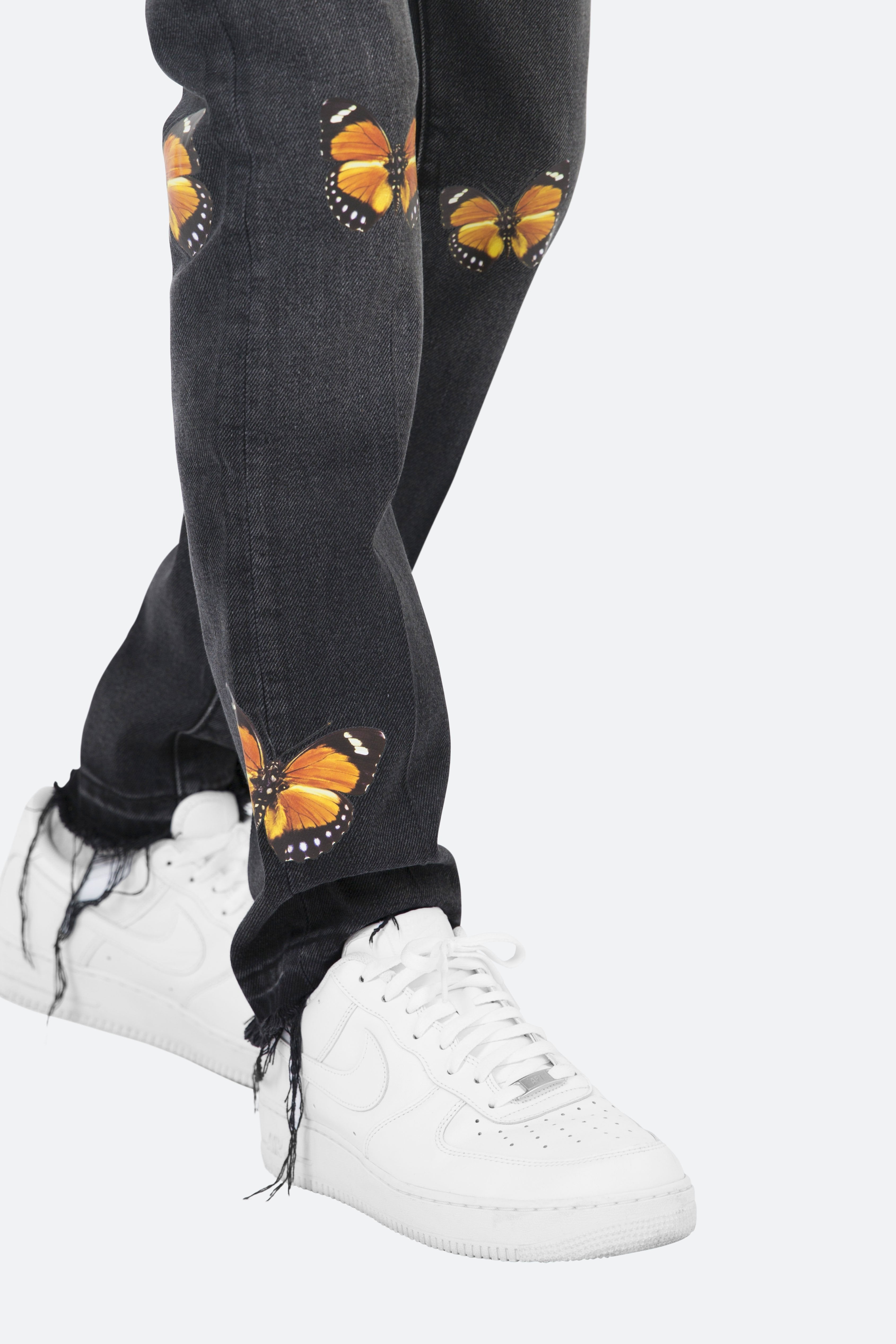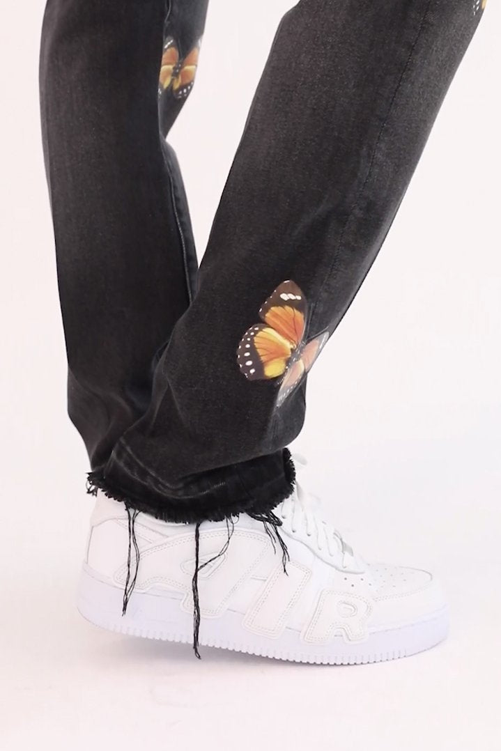 the D223 Butterfly?Denim is designed with our new D fit which is relaxed throughout with an extended inseam for stacking?and?full color butterfly heat press artwork?throughout and finished with an unconstructed hem.