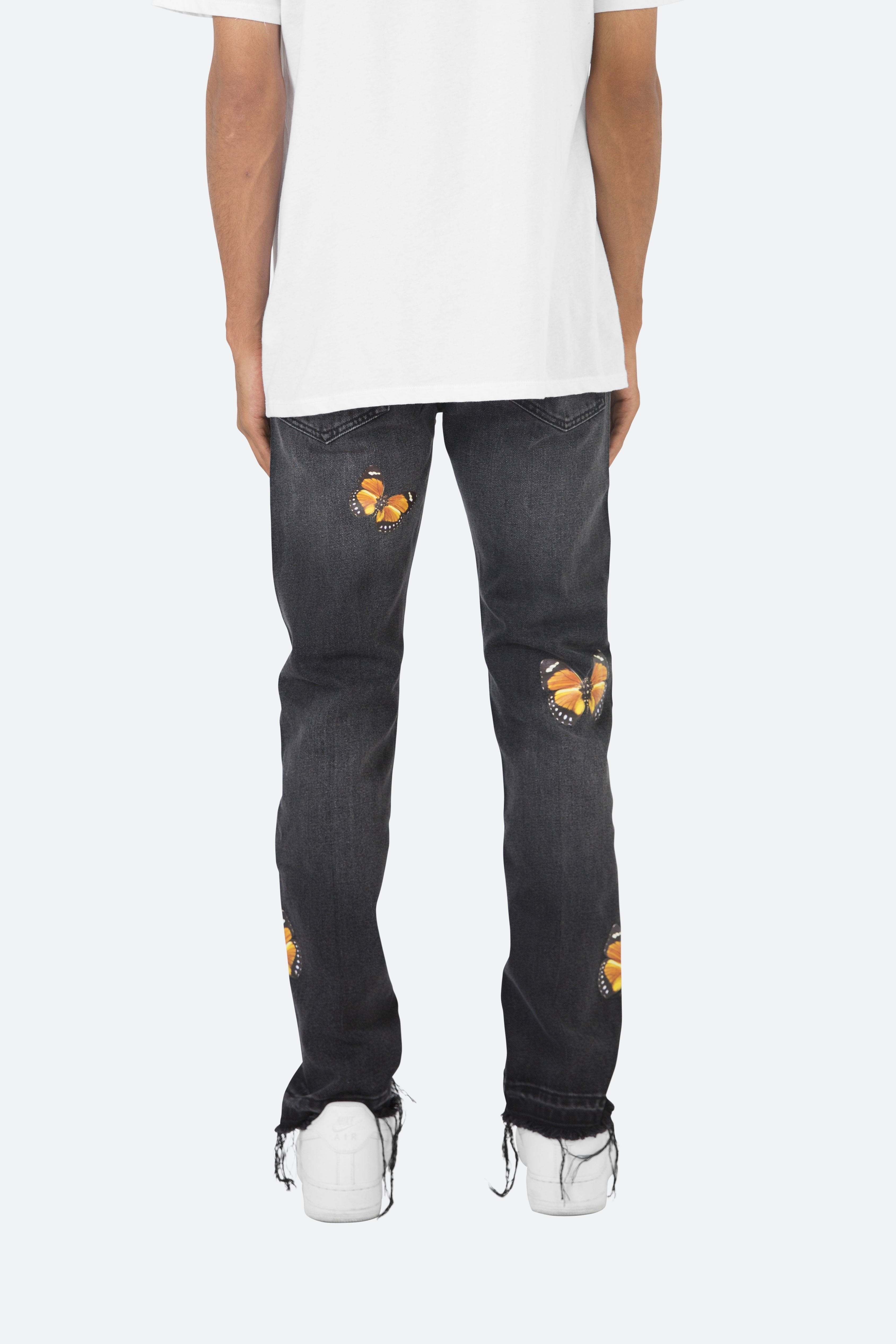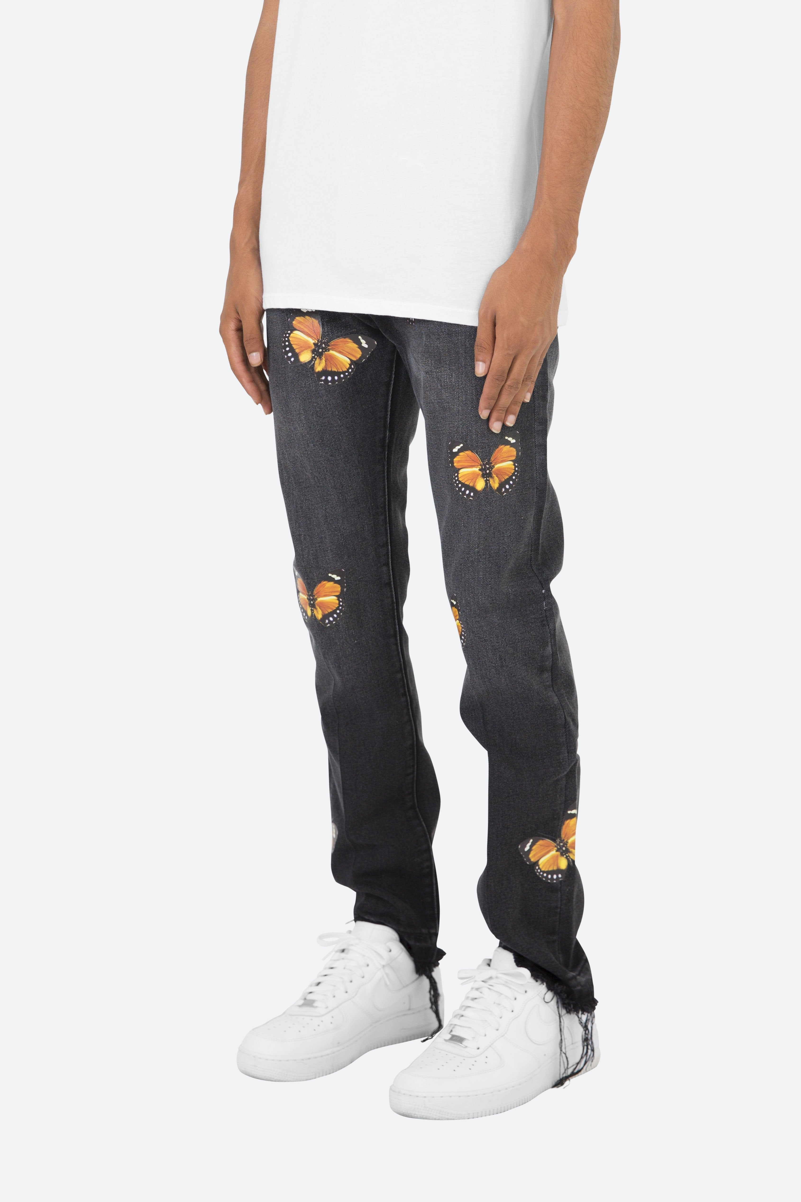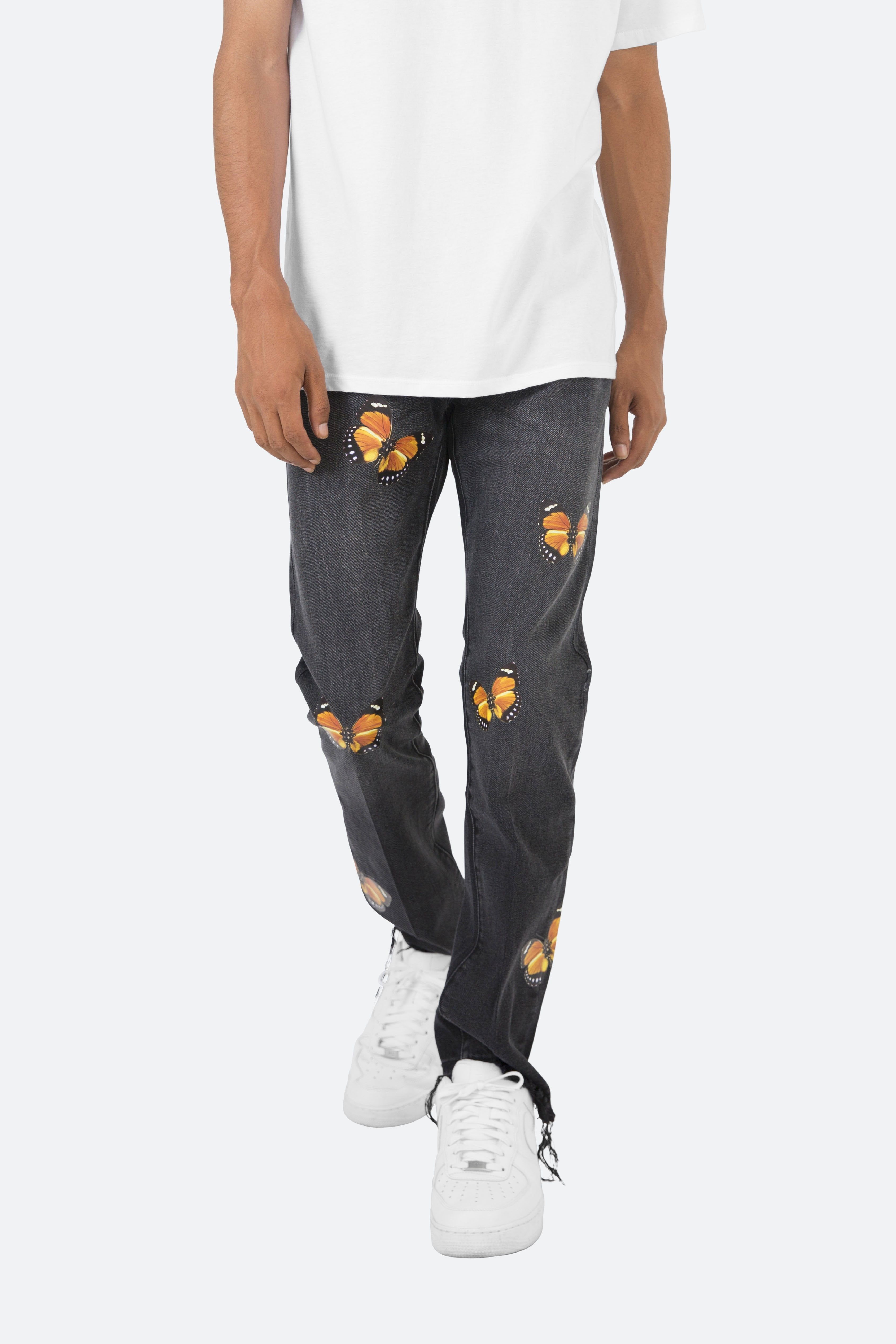 the D223 Butterfly?Denim is designed with our new D fit which is relaxed throughout with an extended inseam for stacking?and?full color butterfly heat press artwork?throughout and finished with an unconstructed hem.