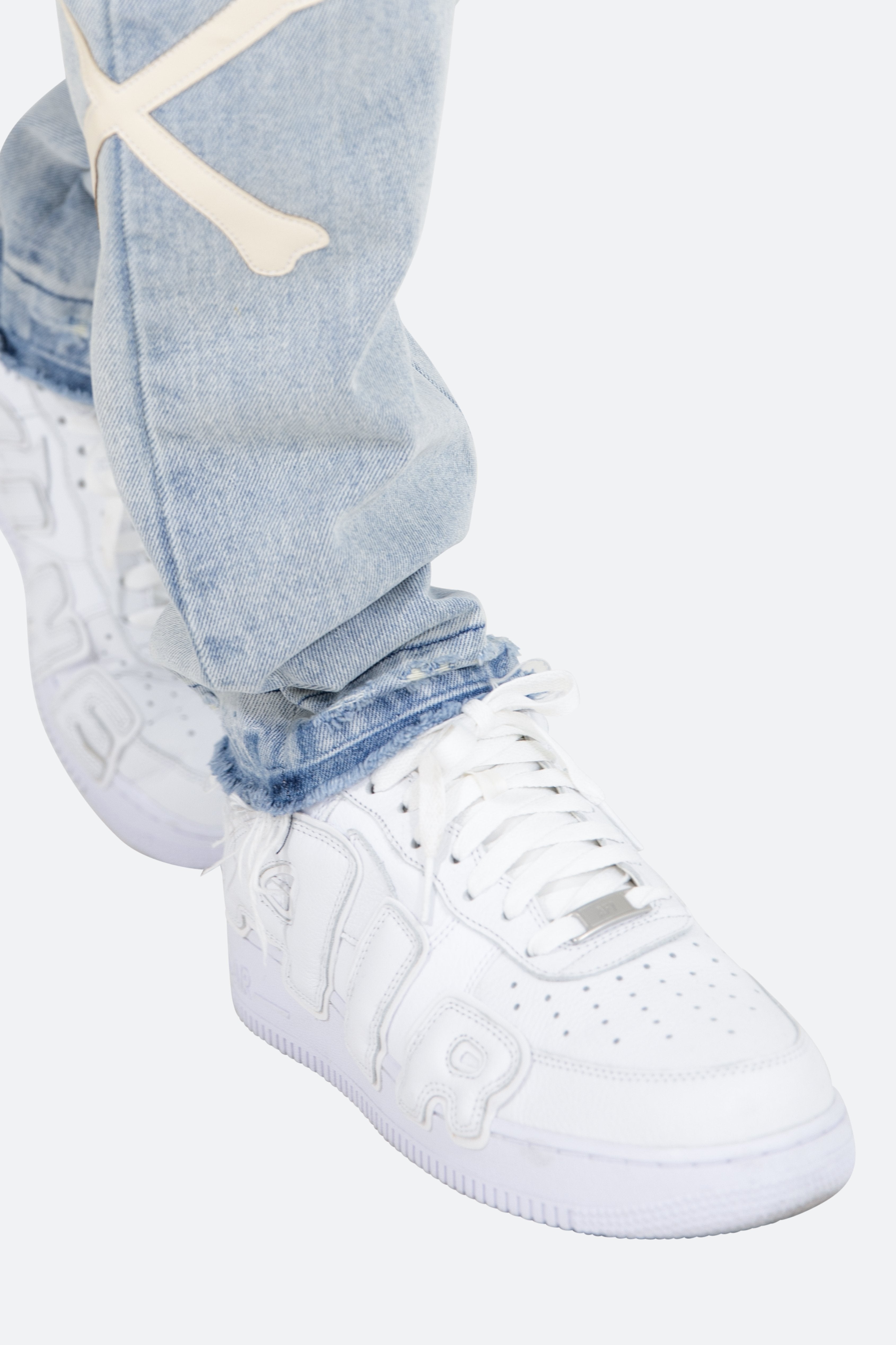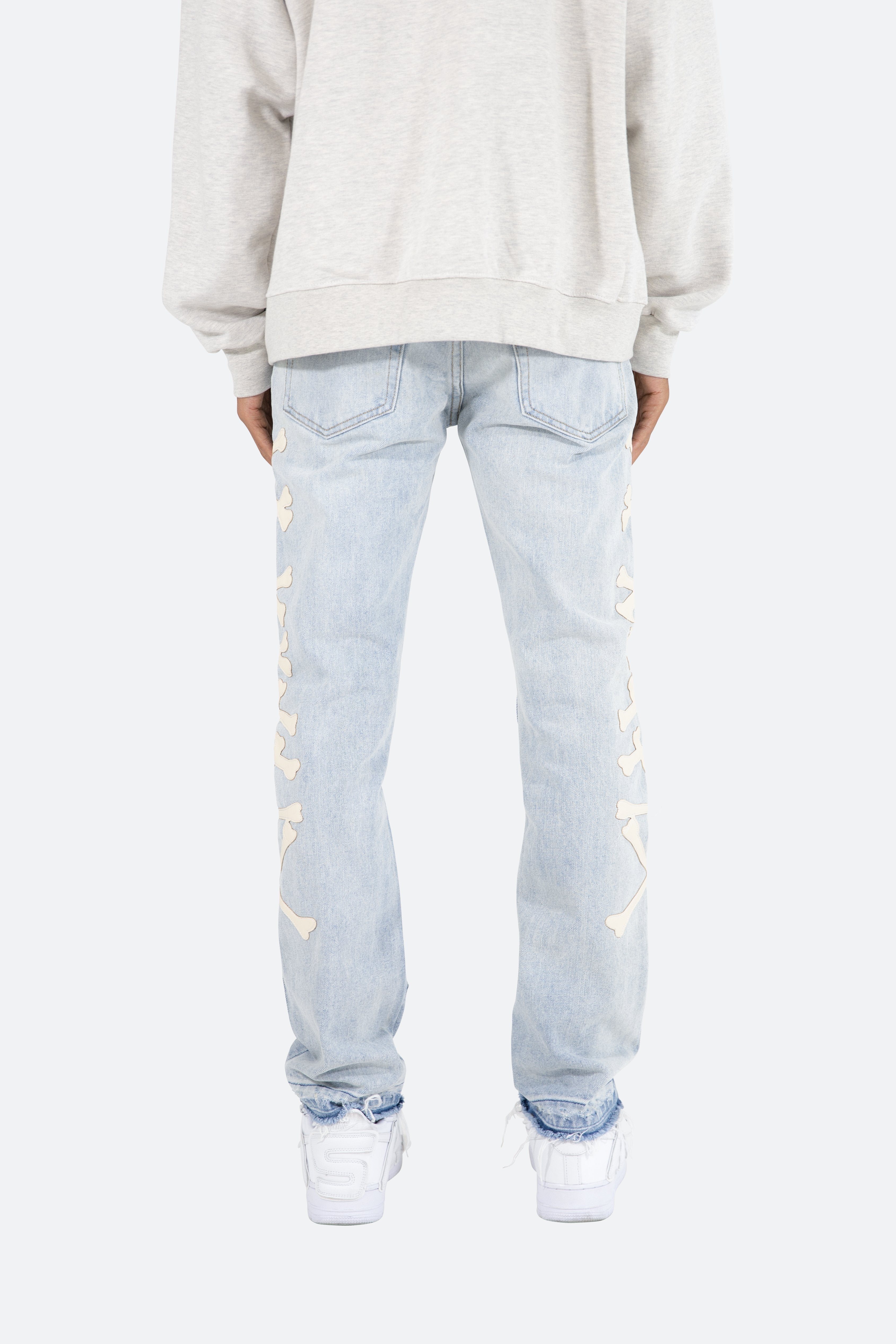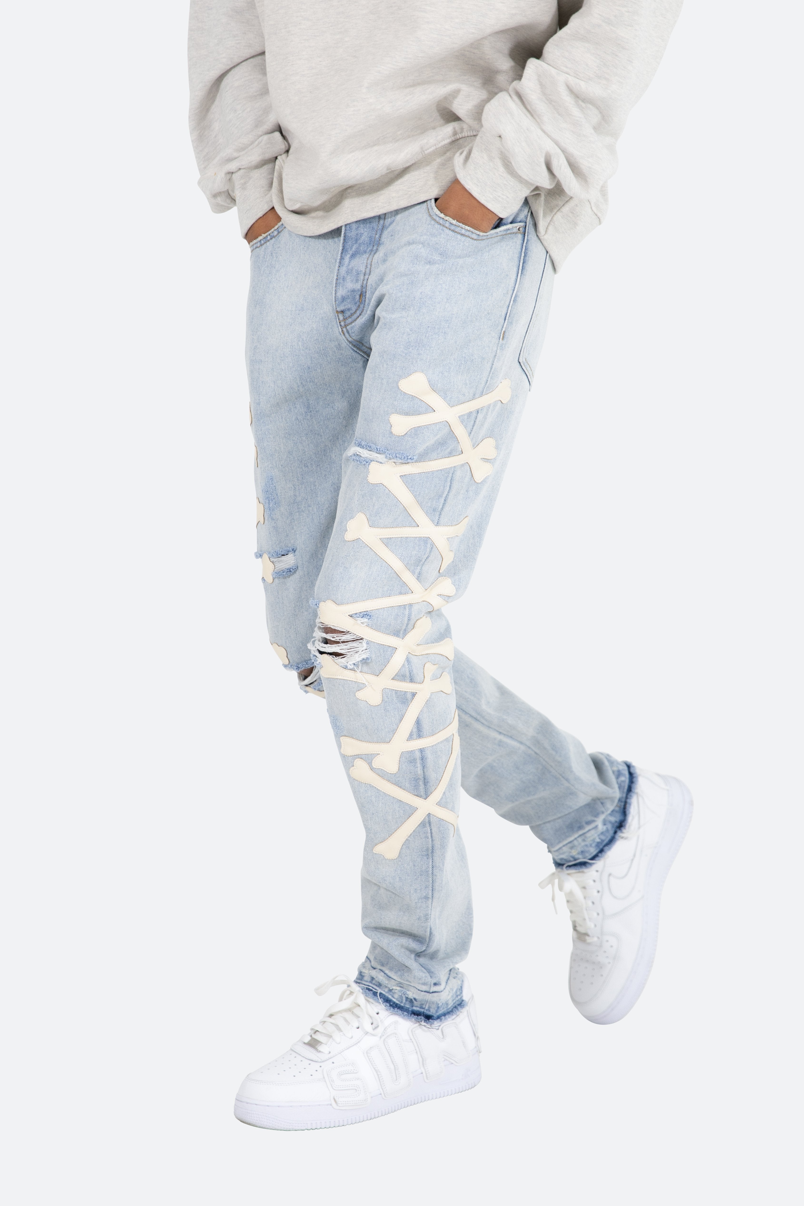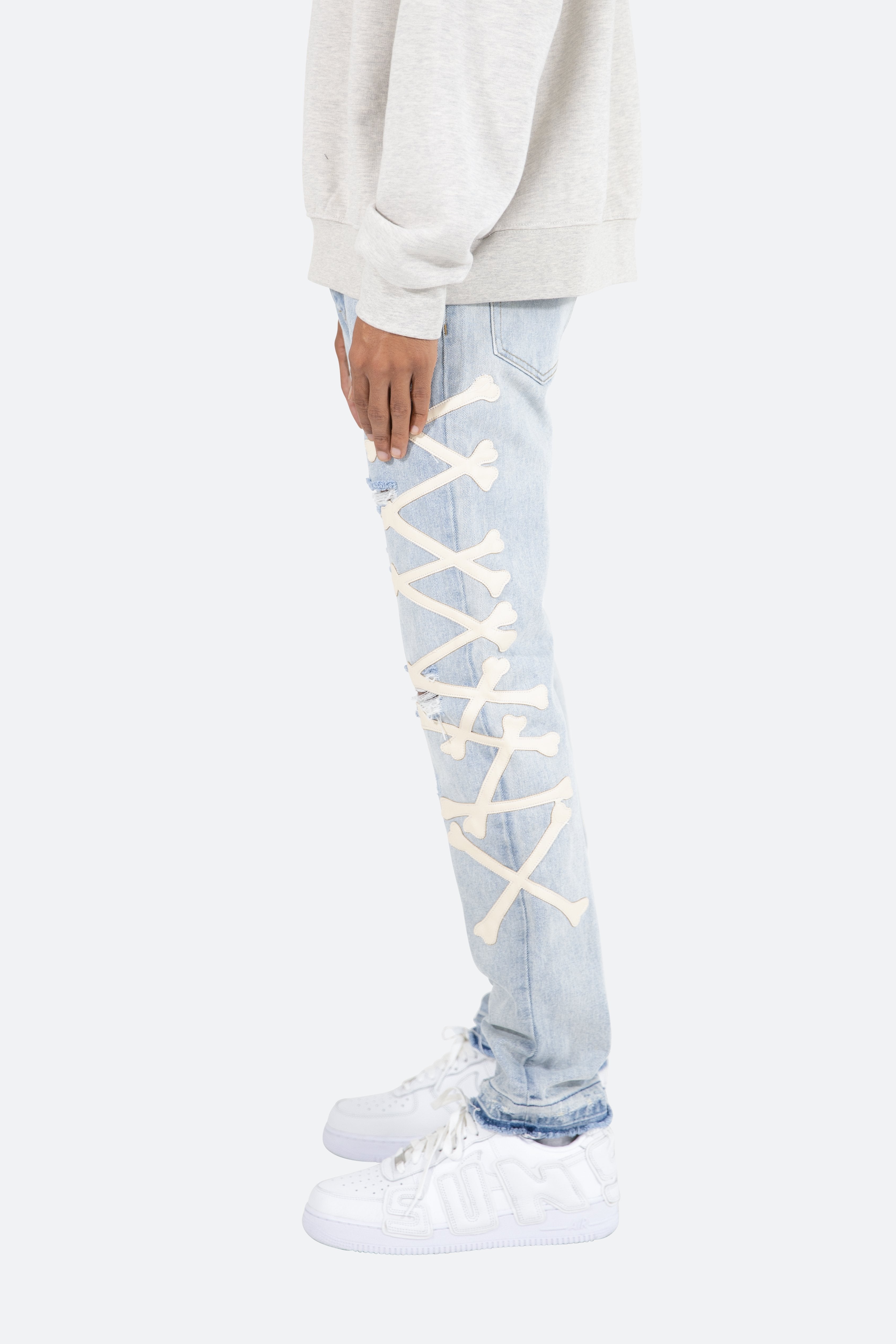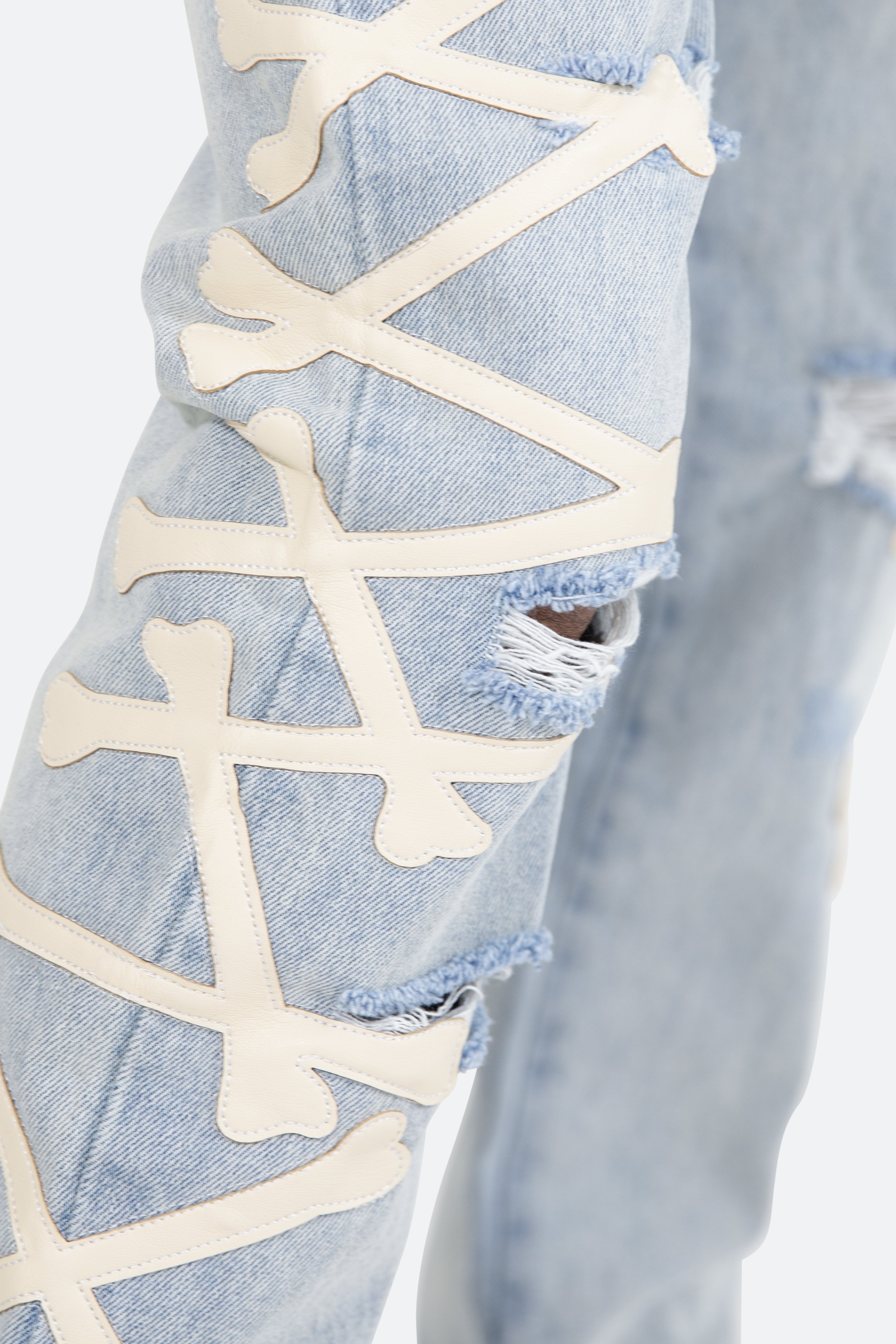 the D279 Skeleton Denim is designed with our new D fit which is relaxed throughout with an extended inseam for stacking?and?features?a warm,?light wash,?distressing, and finished with poly-leather bone patches at the outseam.