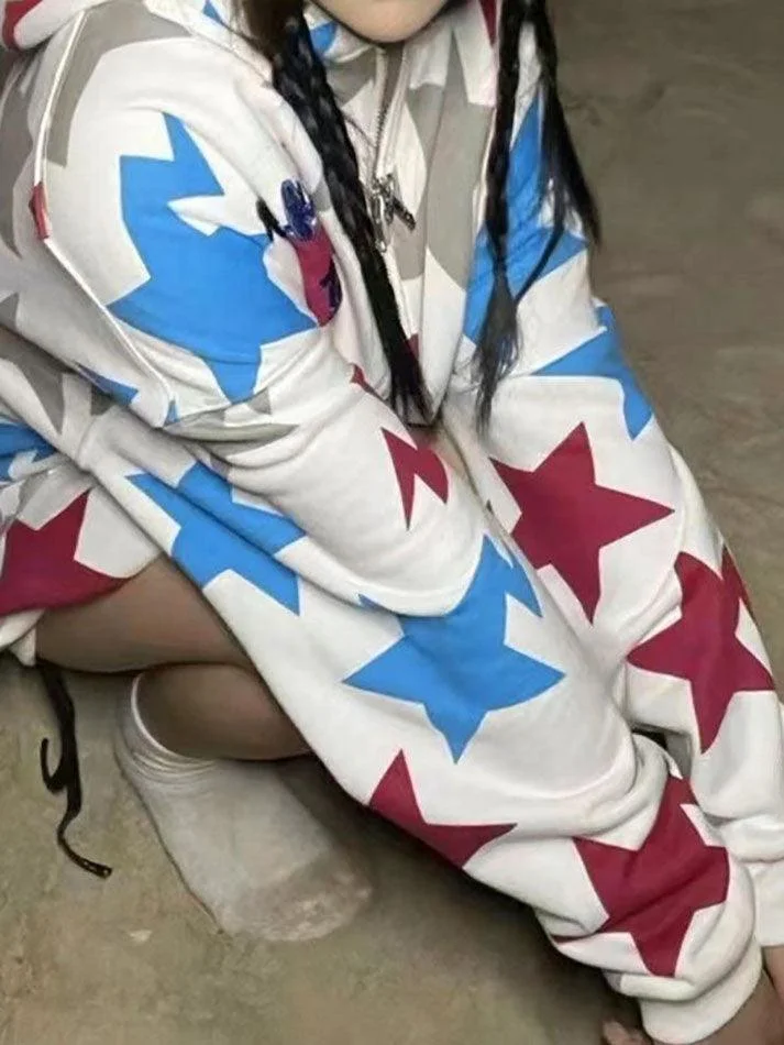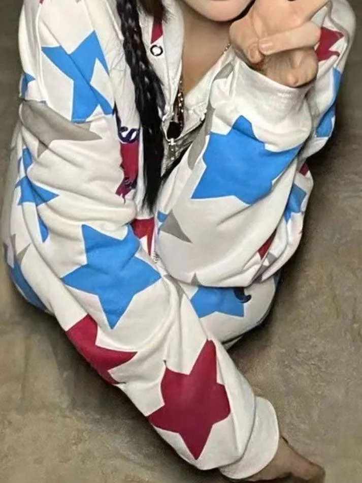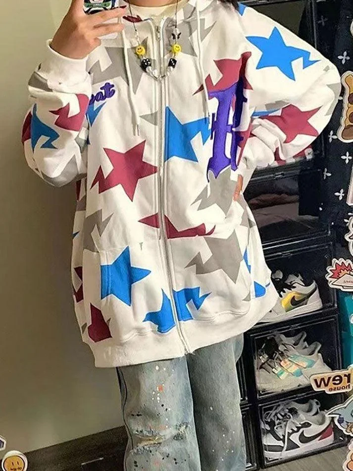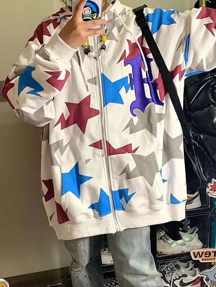 Letter Embroidered Star Graphic Zip Up Hoodie