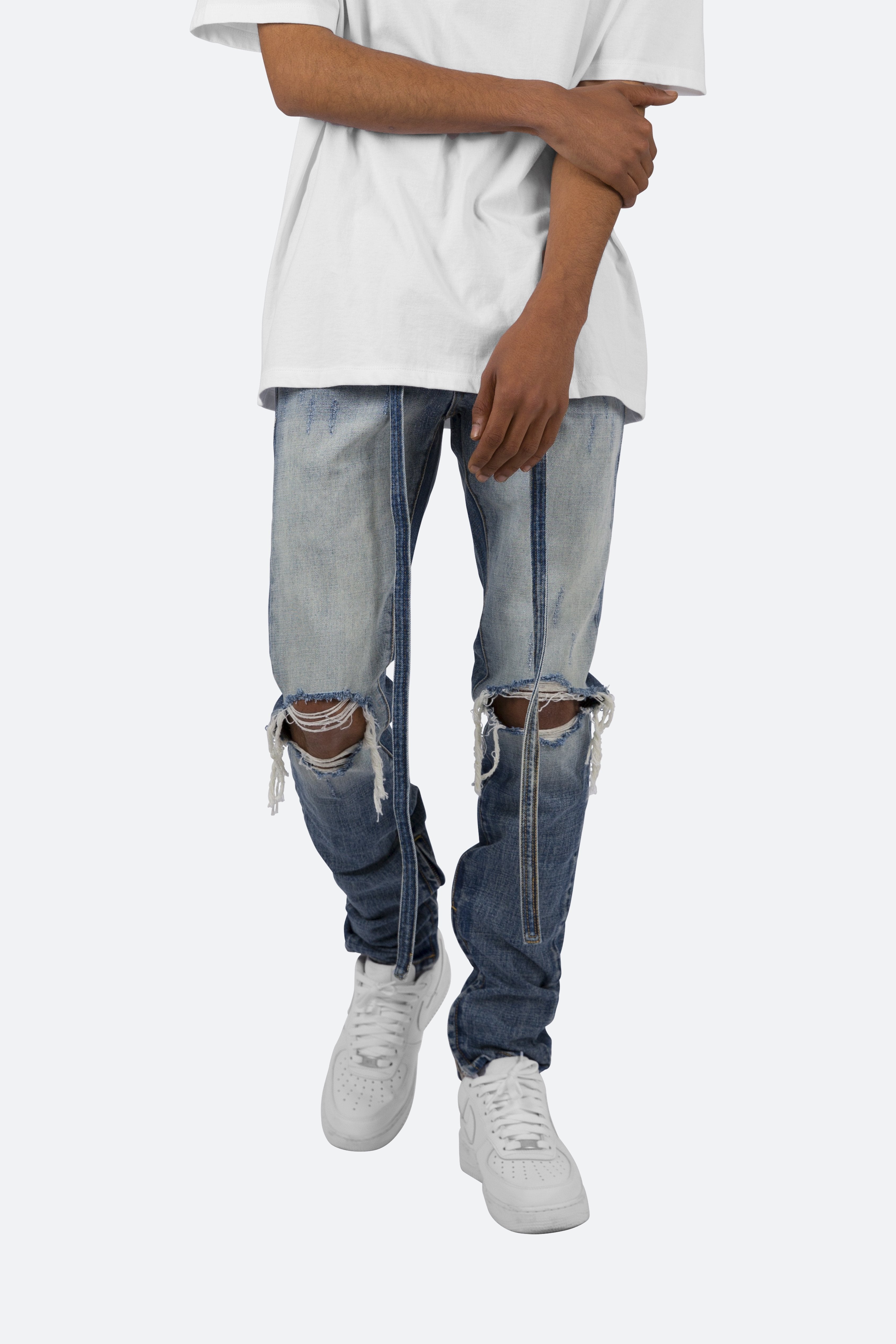 the M3 Denim is designed with a relaxed fit through the thigh that tapers from the knee to the ankle, featuring distress details at the knee,? a 10" concealed zipper on the inseam for a carefully optimized fit, and finished with a self-fabric belt.