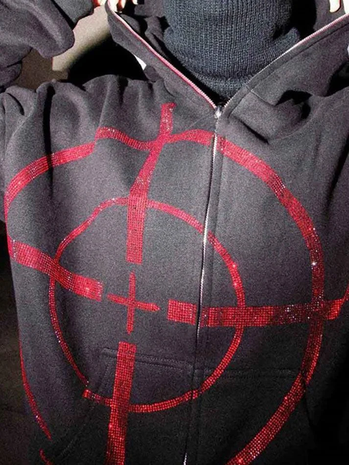 Description: These chic punk-vibe hoodies are shaped to a relaxed silhouette, designed with rhinestone gothic letter pattern on it, with front zip fly and dropped long sleeves detailing.