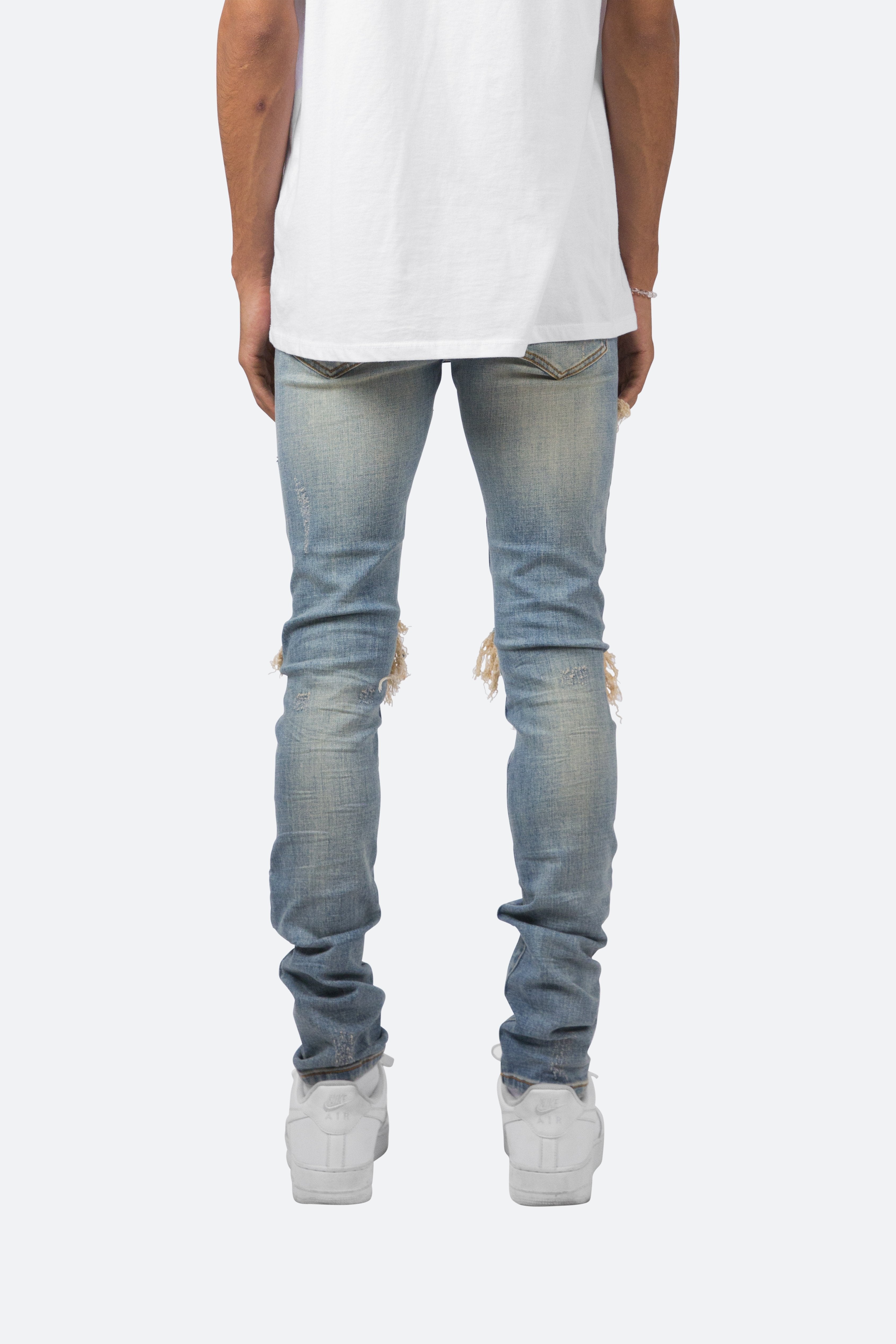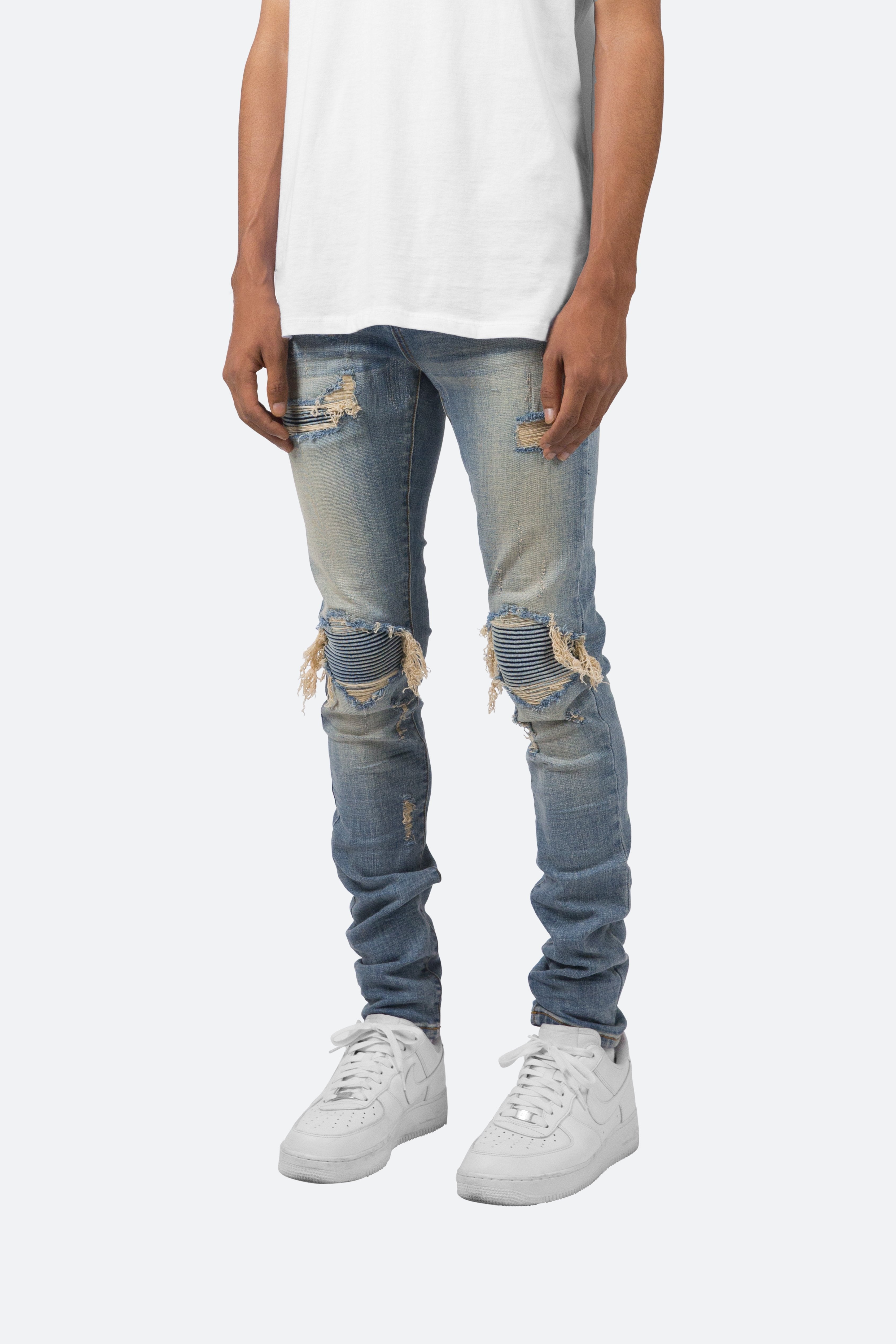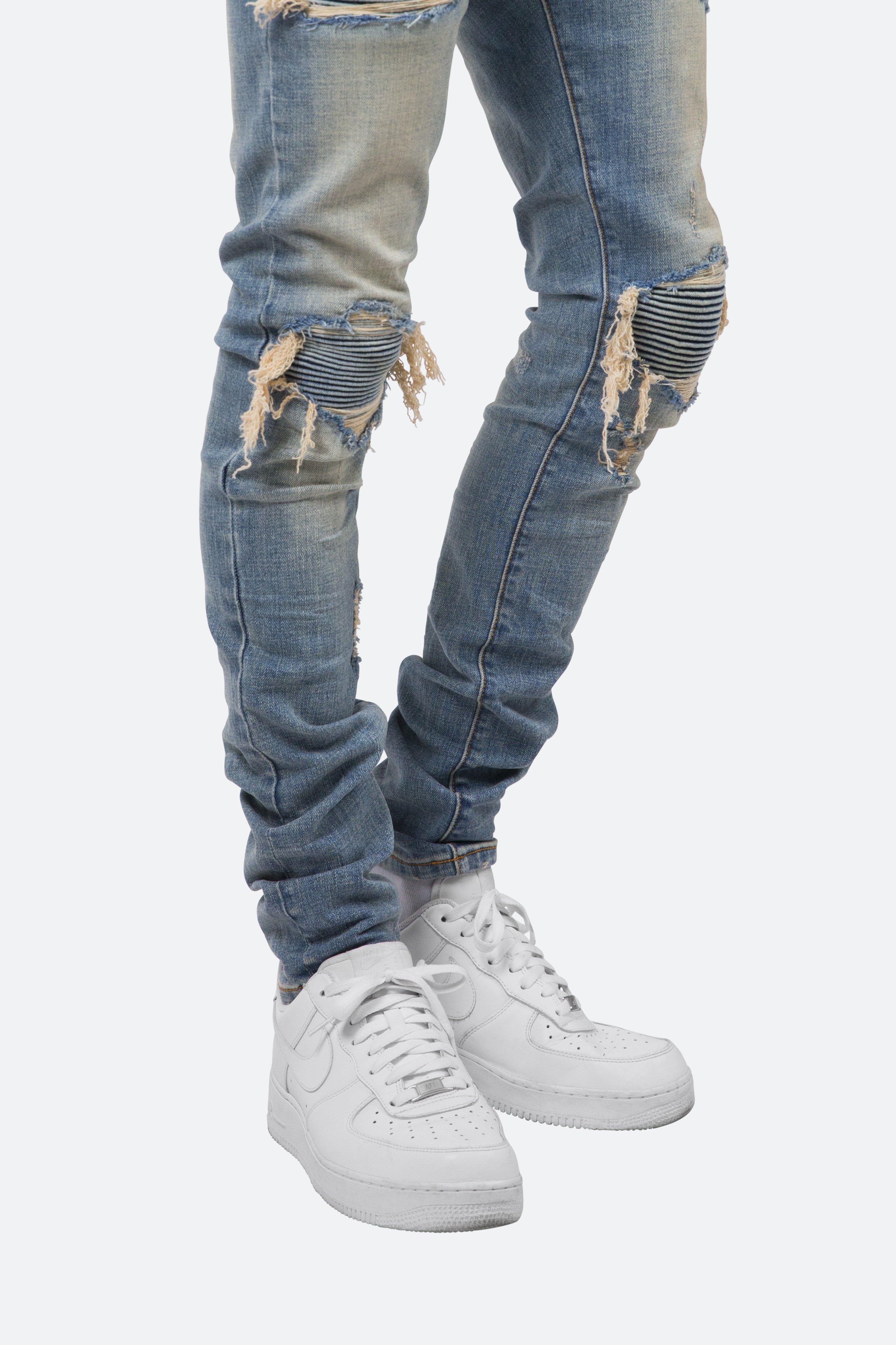 the X162 Stretch Denim is designed with?our new X fit which is? skinny?throughout?with?an extended inseam for stacking, and features?a medium?wash, distressing throughout and finished with pin-tucked denim panels repairing the knee holes.