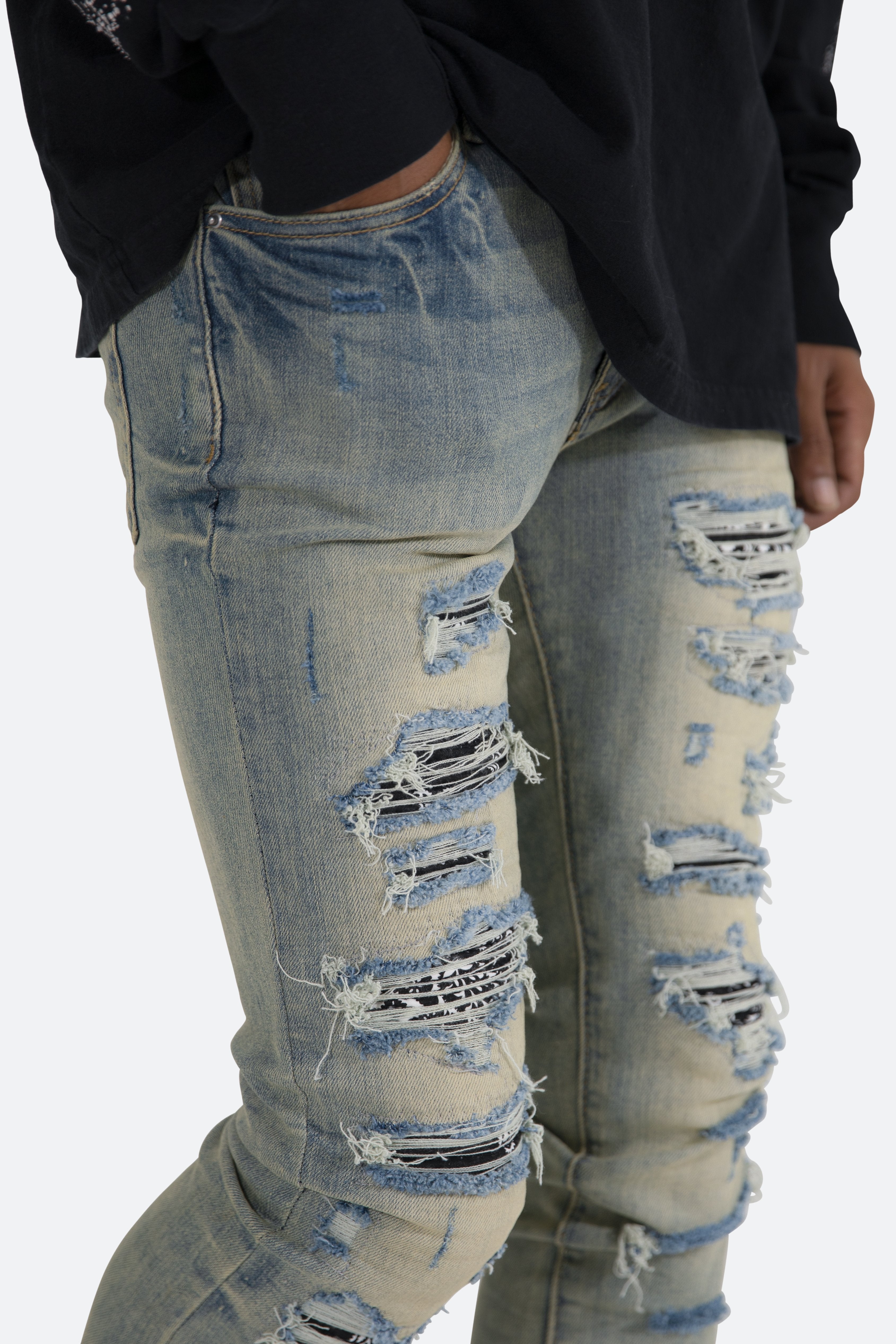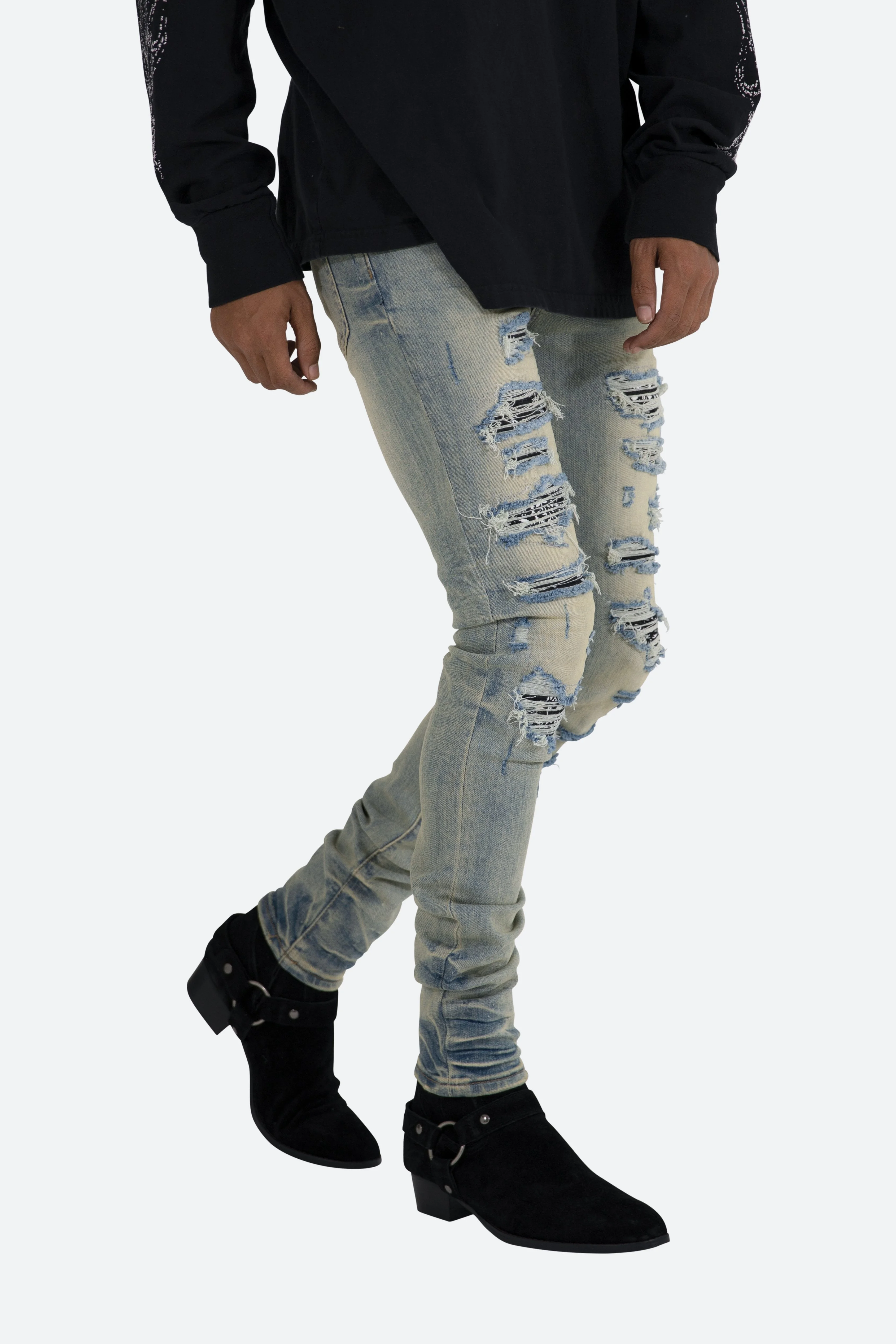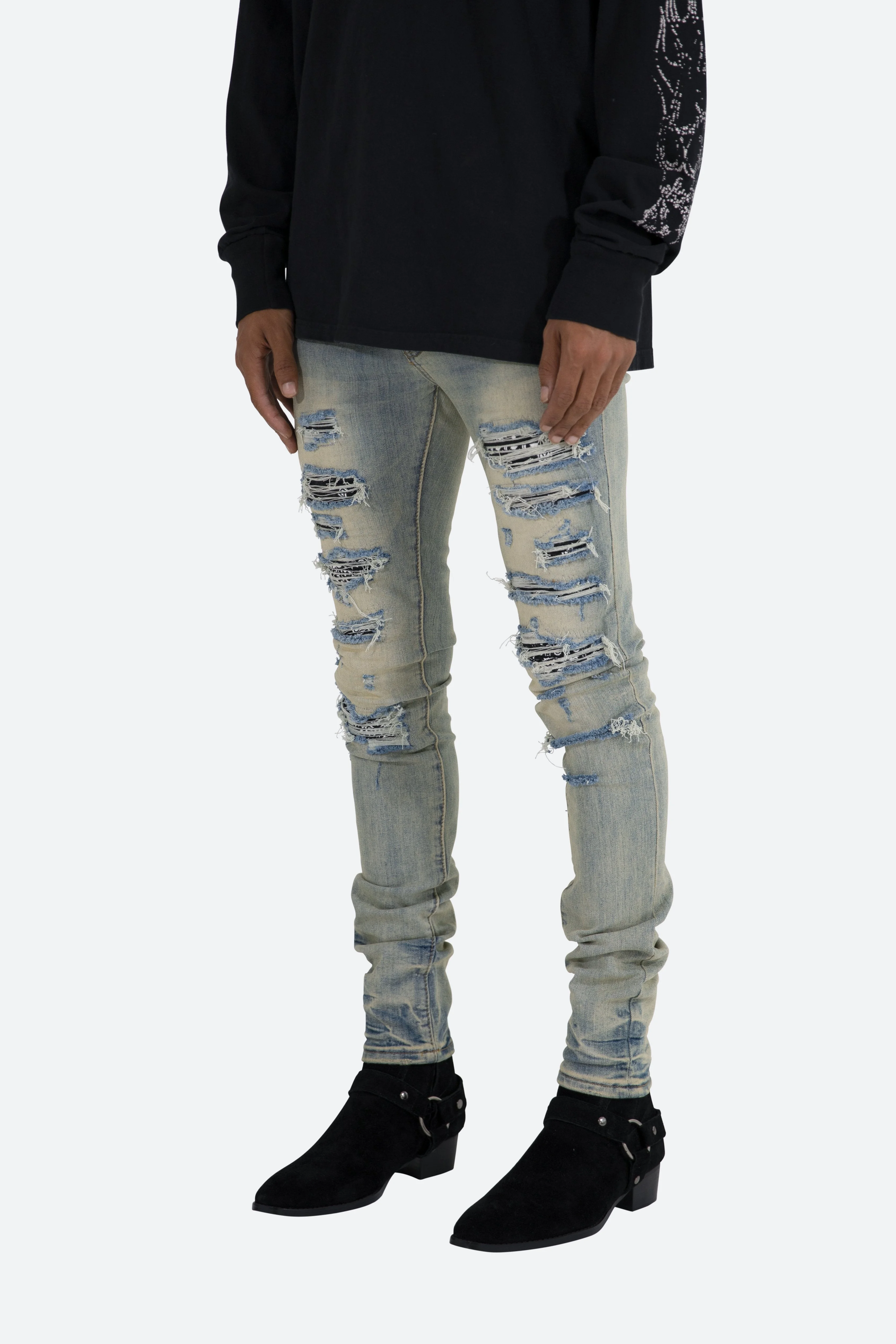the X165?Stretch Paisley Denim is designed with?our new X fit which is? skinny?throughout?with?an extended inseam for stacking, and features distressing throughout and finished with pin-tucked?paisley printed?panels repairing the holes at the knees and thigh.
