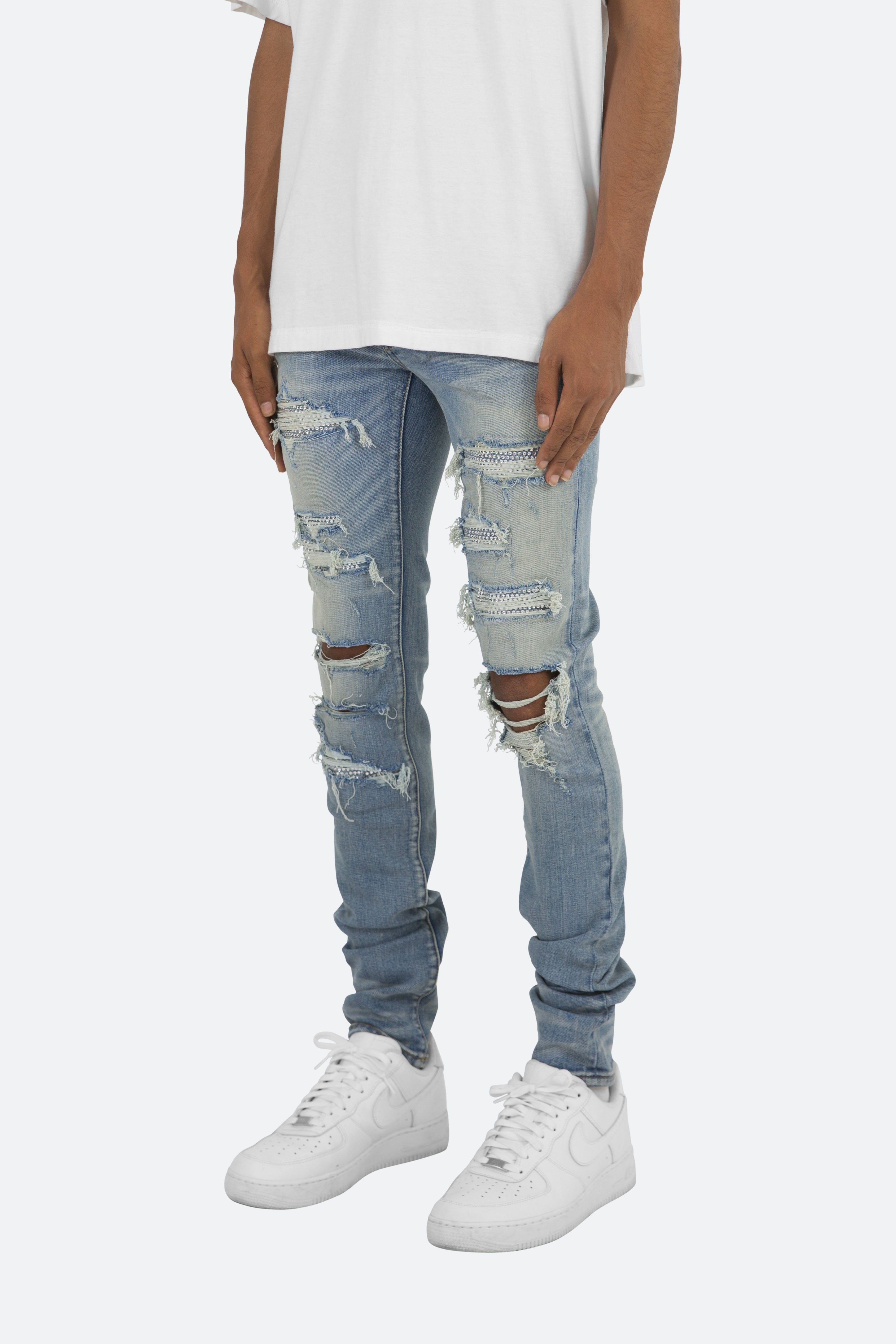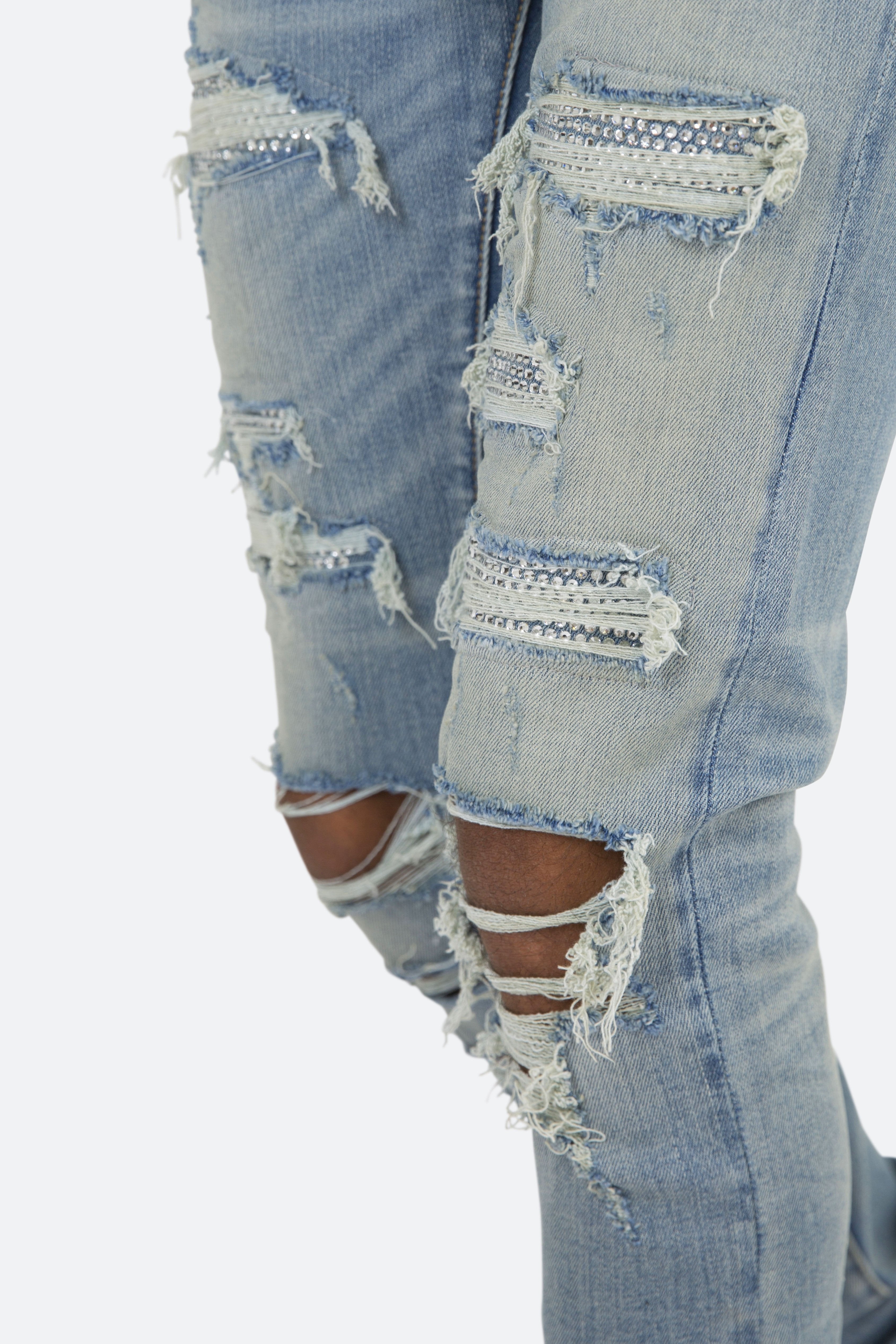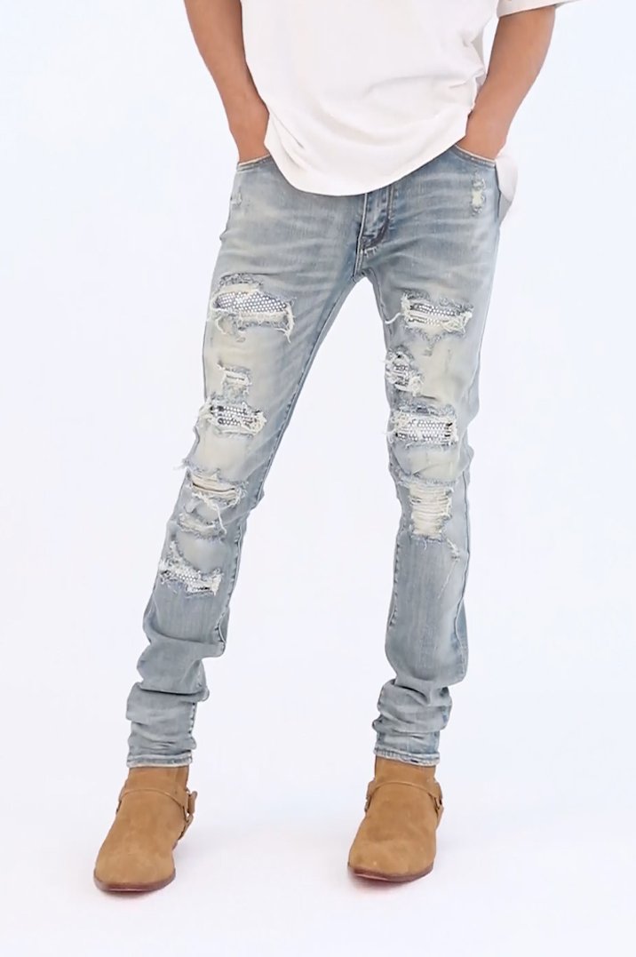 the X201 Stretch Denim is designed with?our new X fit which is? skinny?throughout?with?an extended inseam for stacking, and features?distressing throughout, and finished with repair panels with?rhinestones.