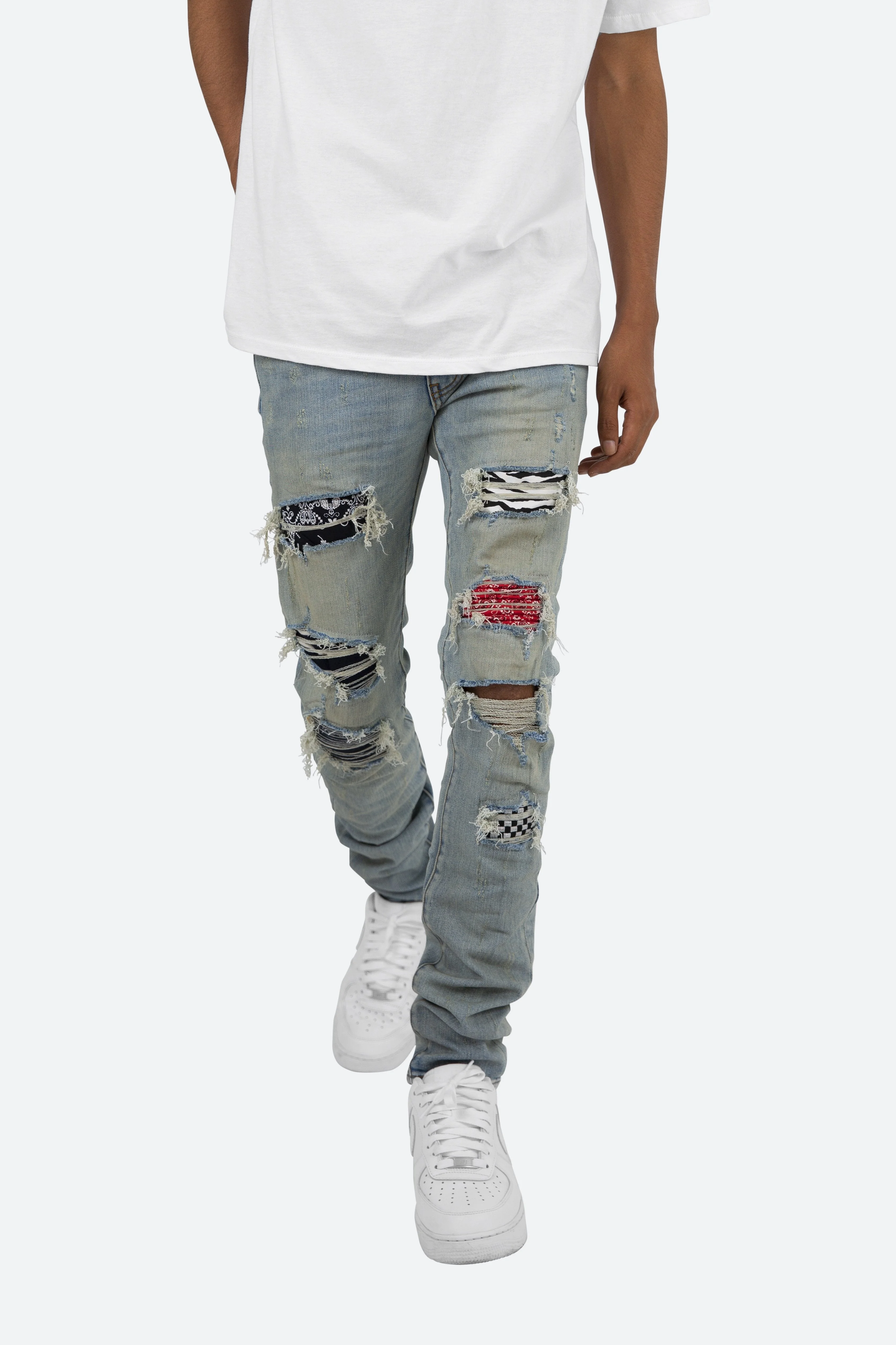 the X214 Stretch Denim is designed with?our new X fit which is? skinny?throughout?with?an extended inseam for stacking, and features?a medium?wash, distressing throughout and finished with mixed printed fabric repairs in both the knees and thigh distressing.