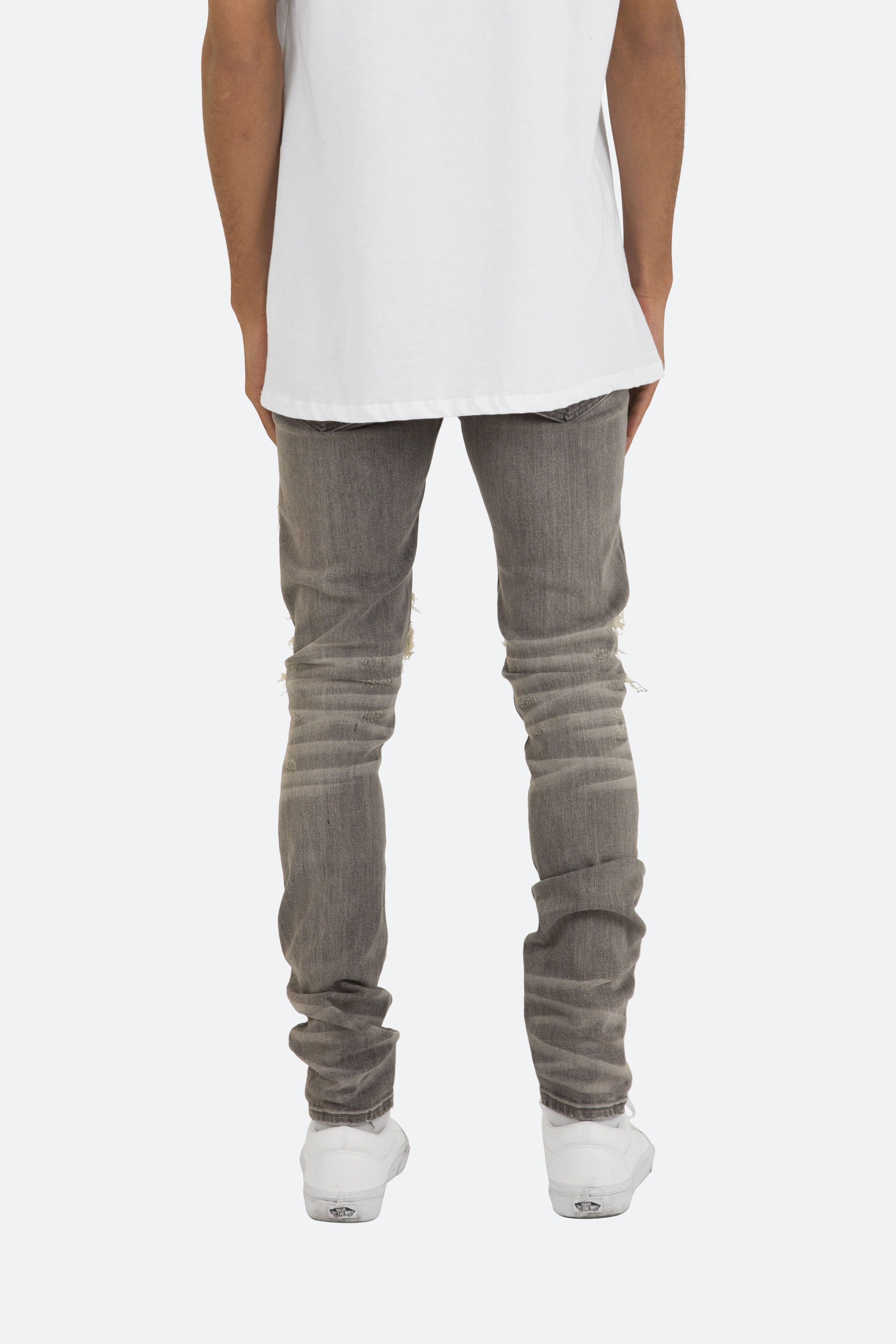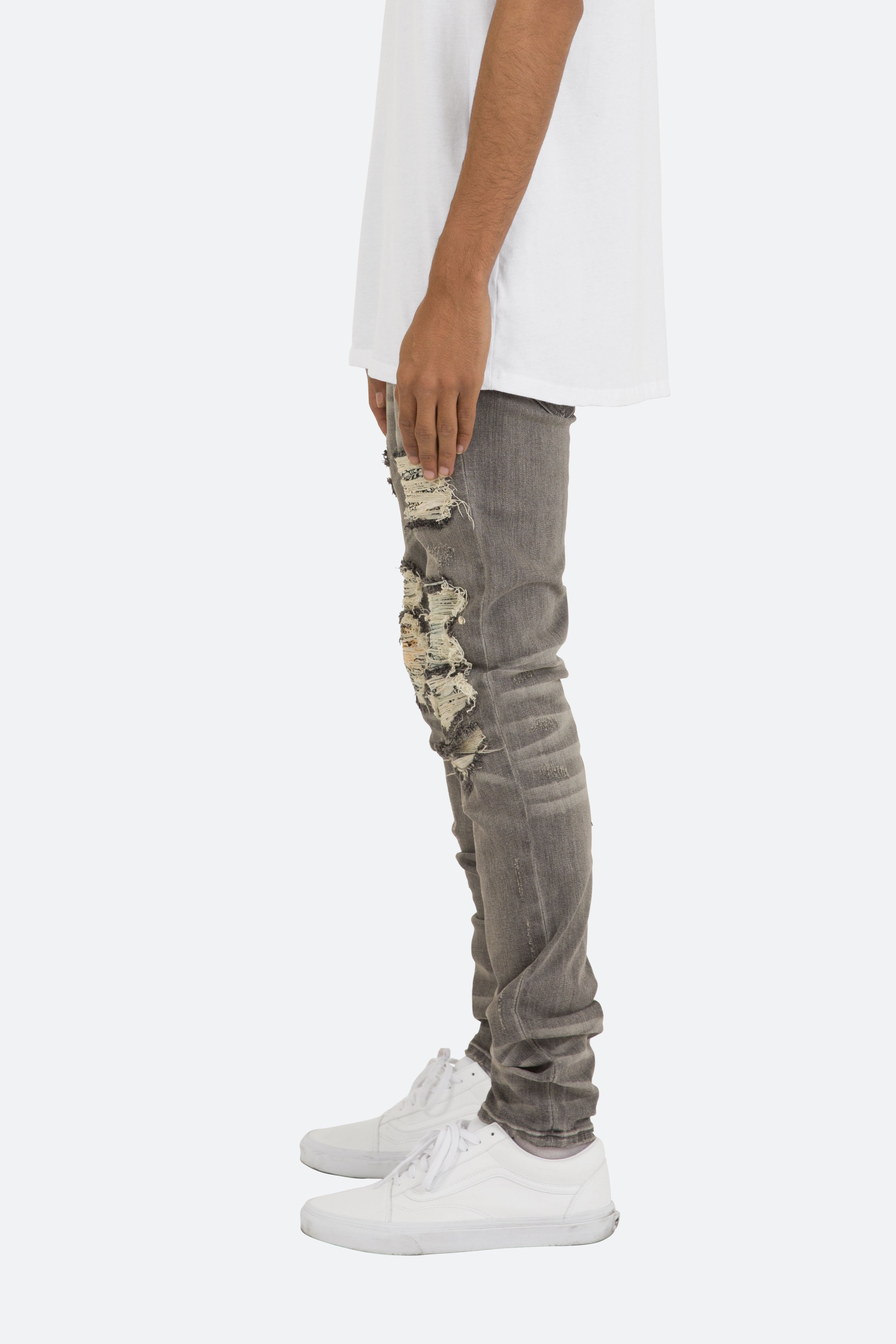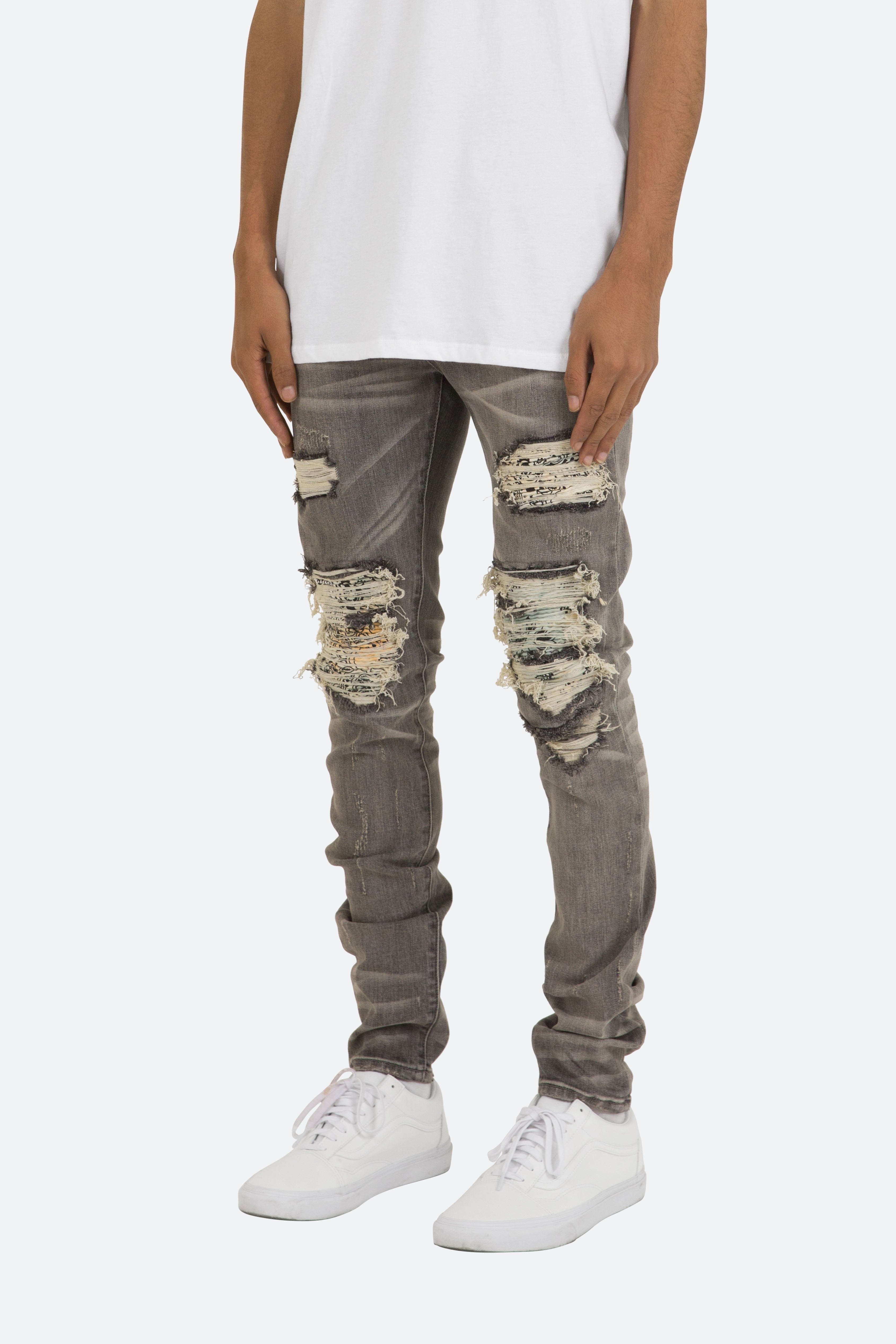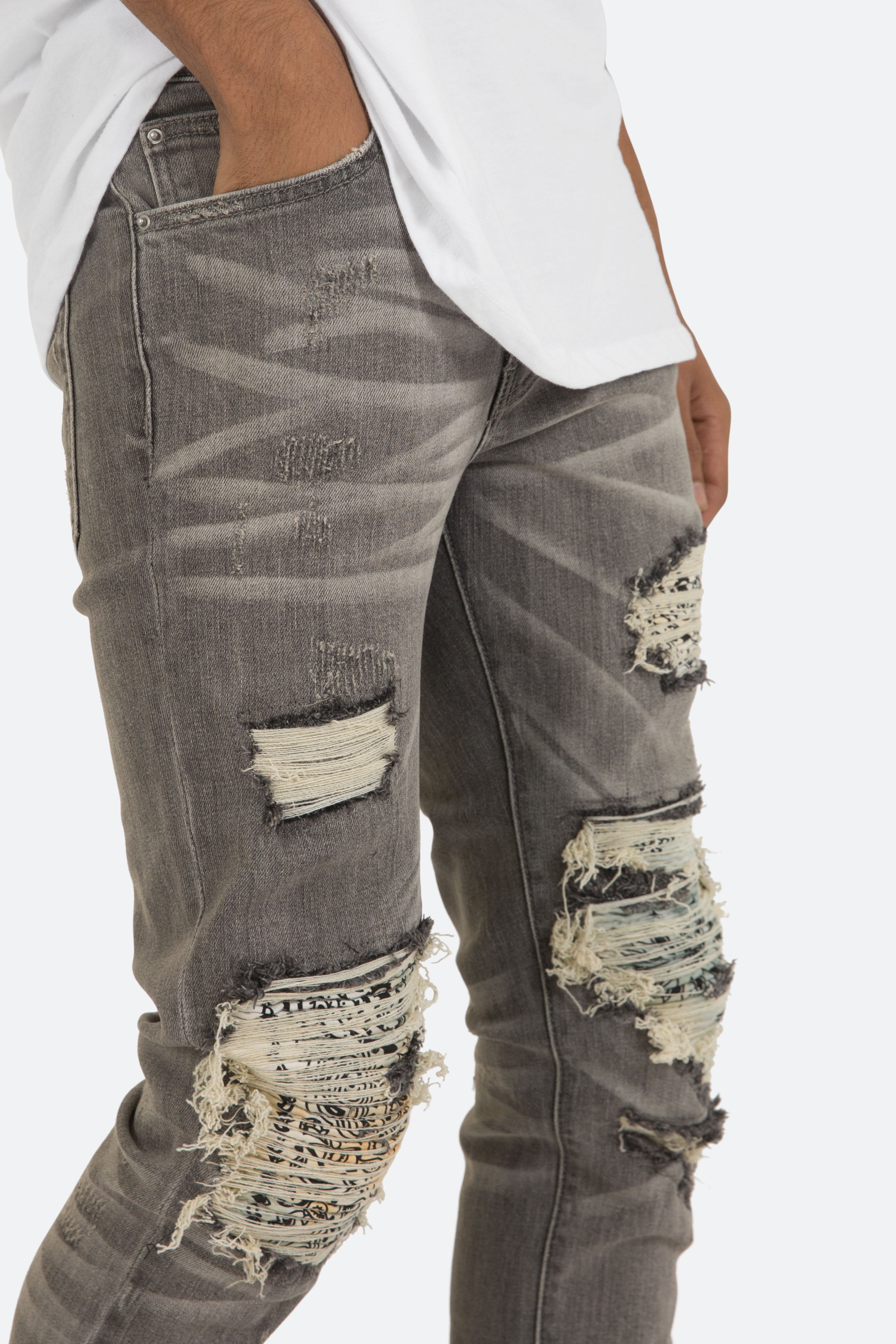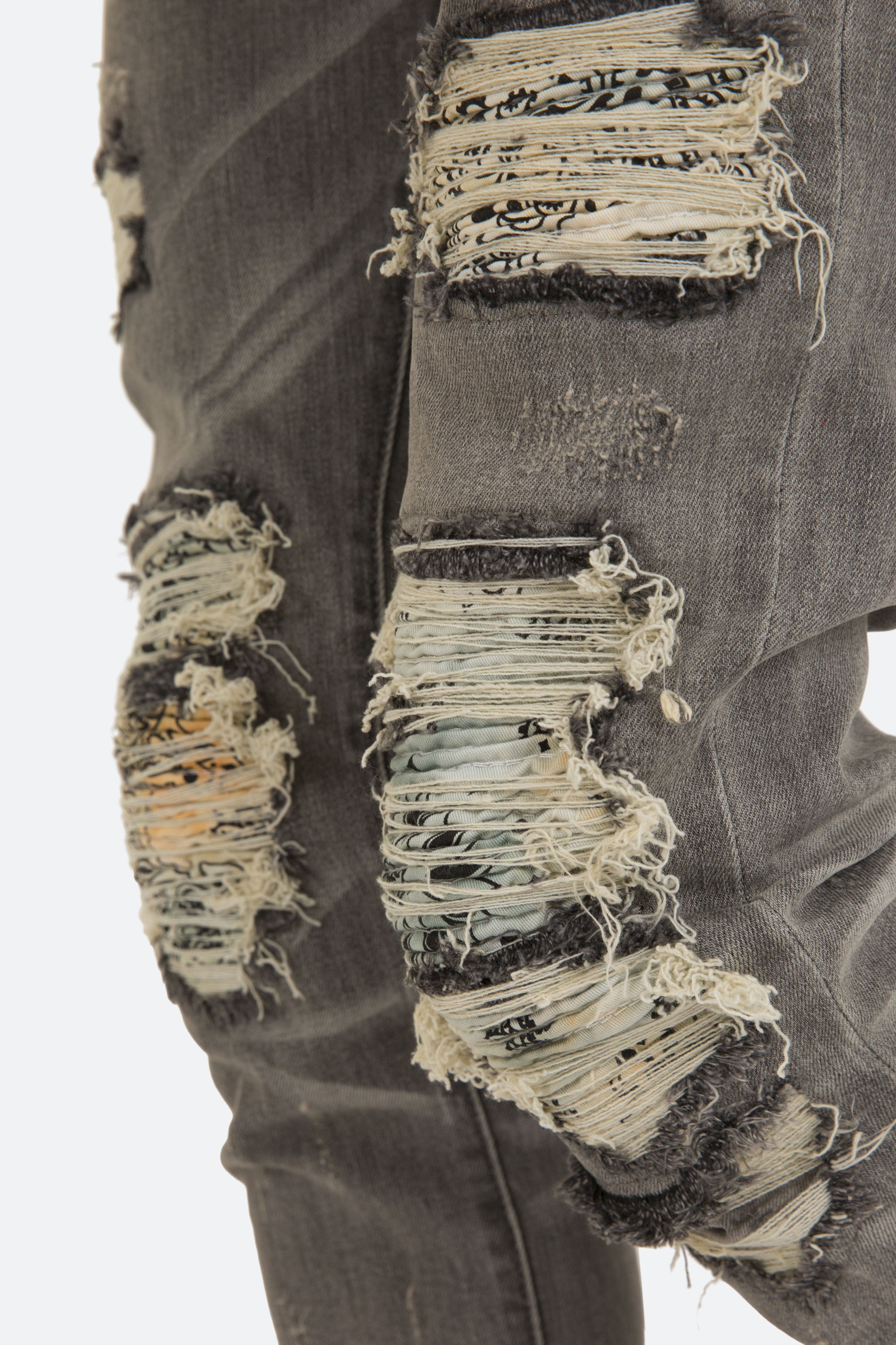 the X284 Stretch Moto Denim is designed with?our new X fit which is? skinny?throughout?with?an extended inseam for stacking, and features?a?vintage wash, distressing throughout and finished with pin-tucked tie dyed paisley repairing the knee holes.