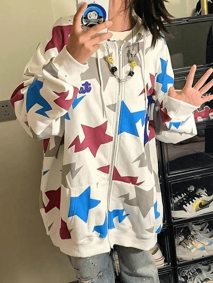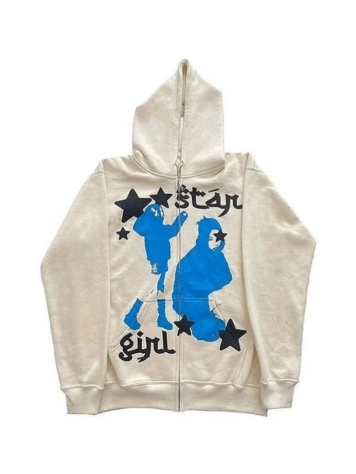 Letter Embroidered Star Graphic Zip Up Hoodie