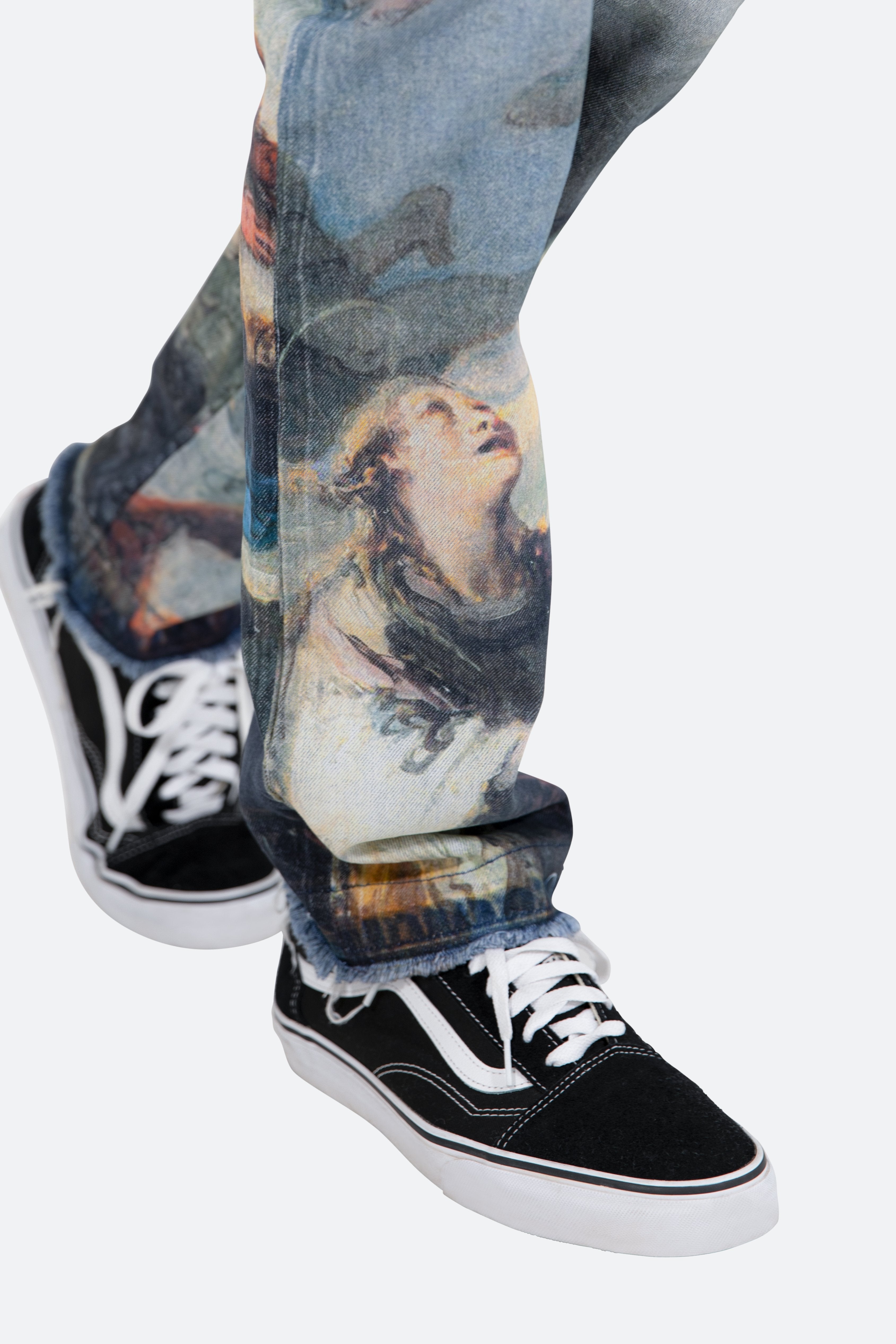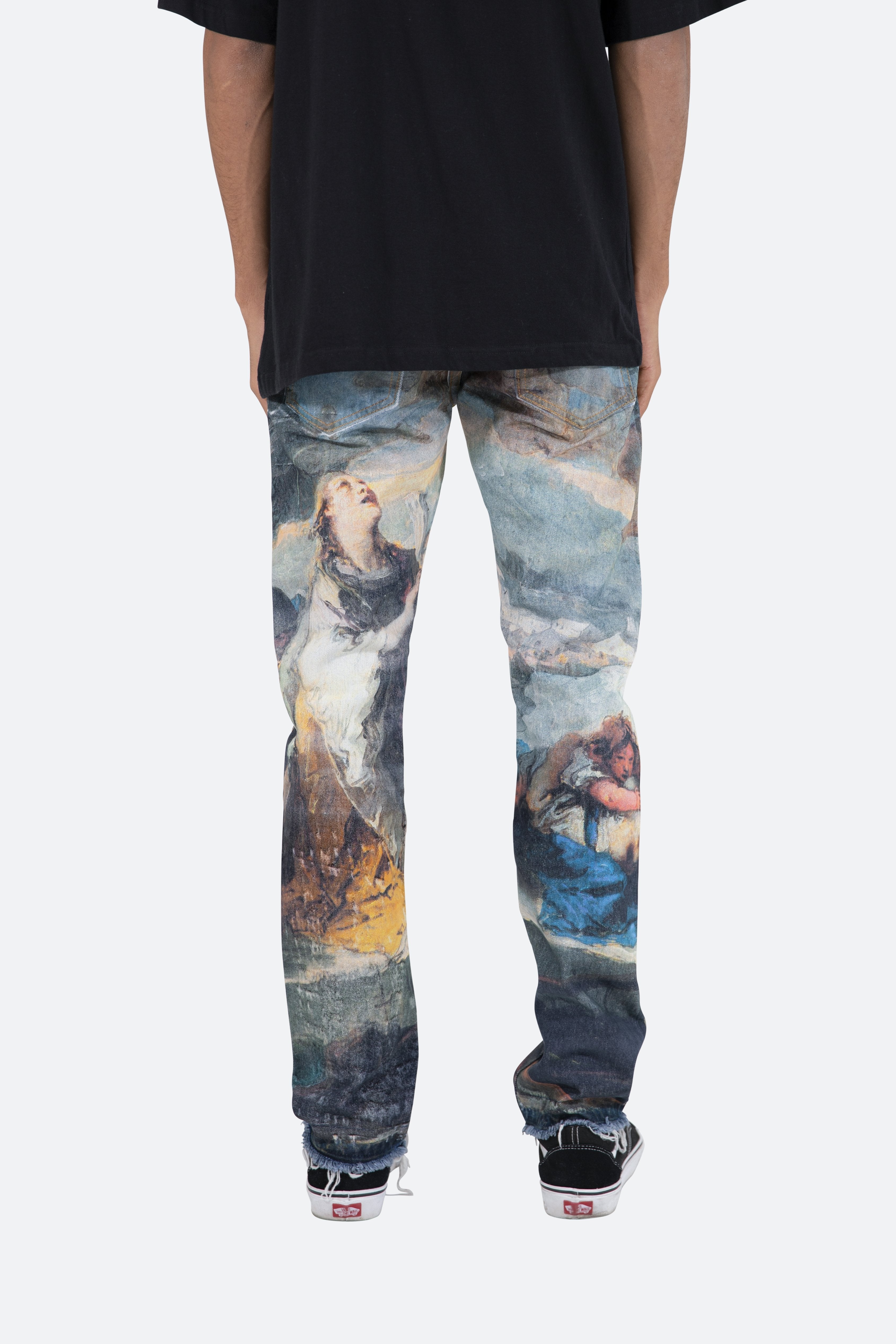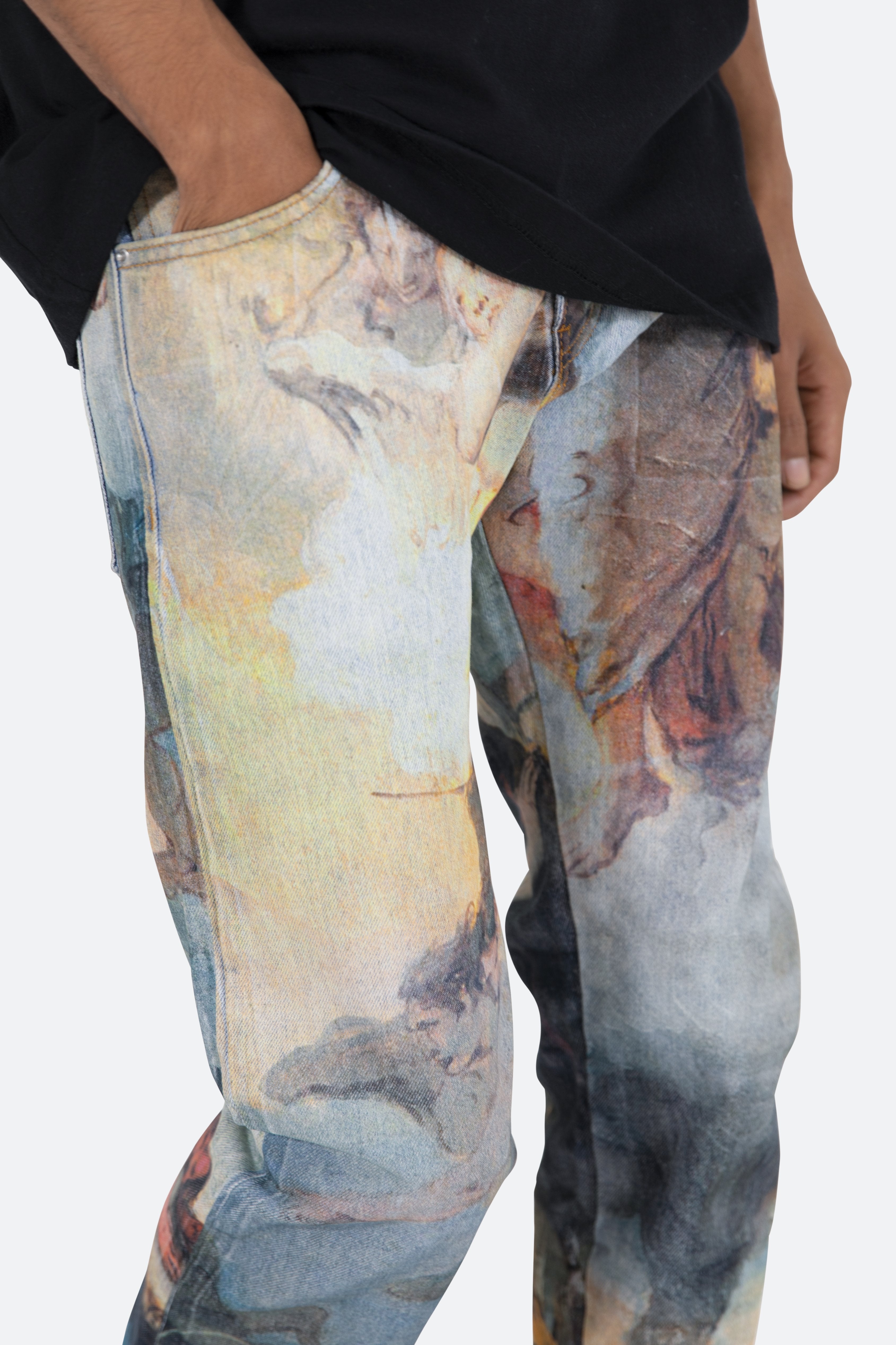 the D205 Overlay Denim is designed with our new D fit which is relaxed throughout with an extended inseam for stacking?and?features?a denim base that is?finished with?an all-over printed?classical painting artwork.