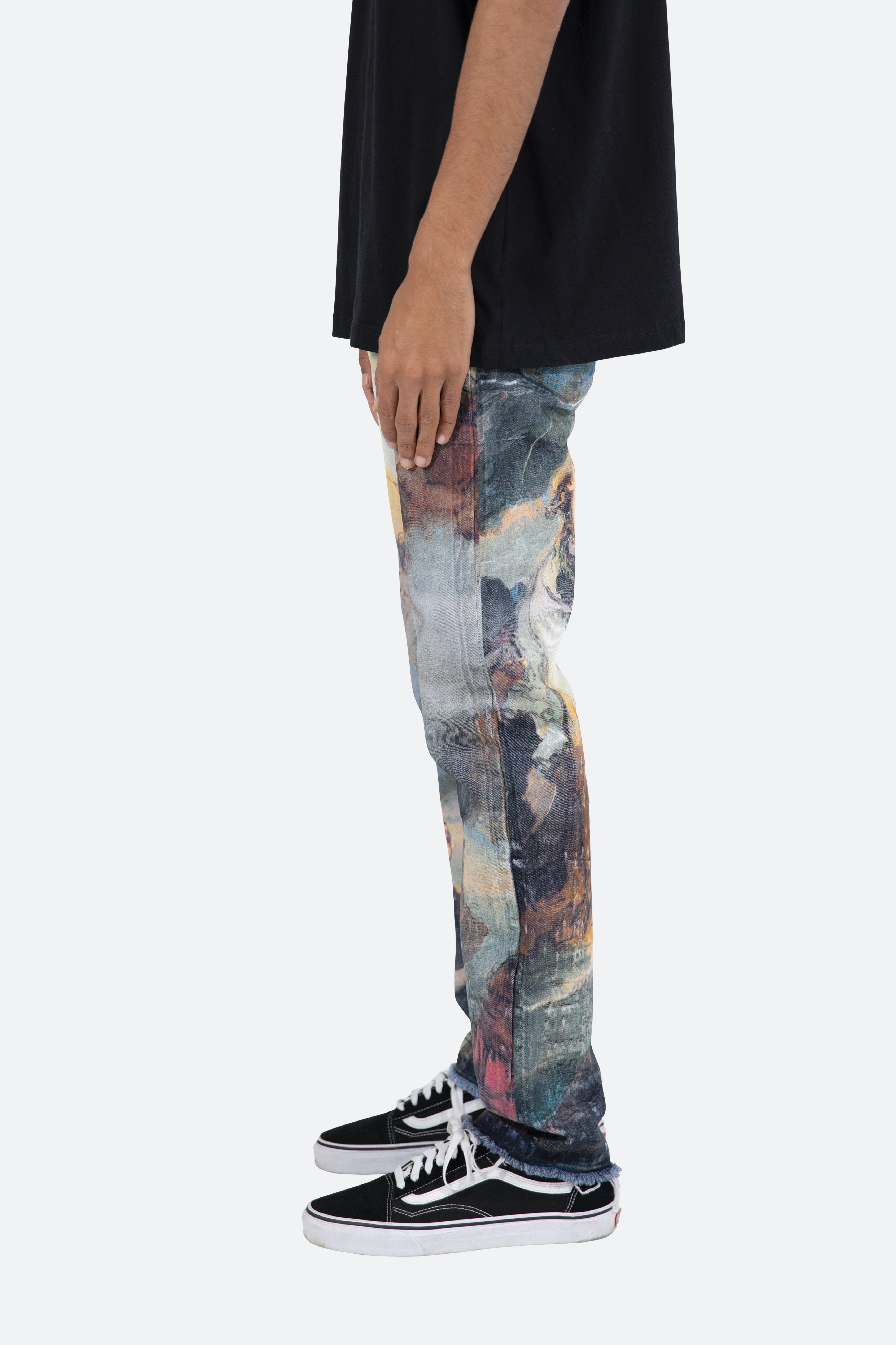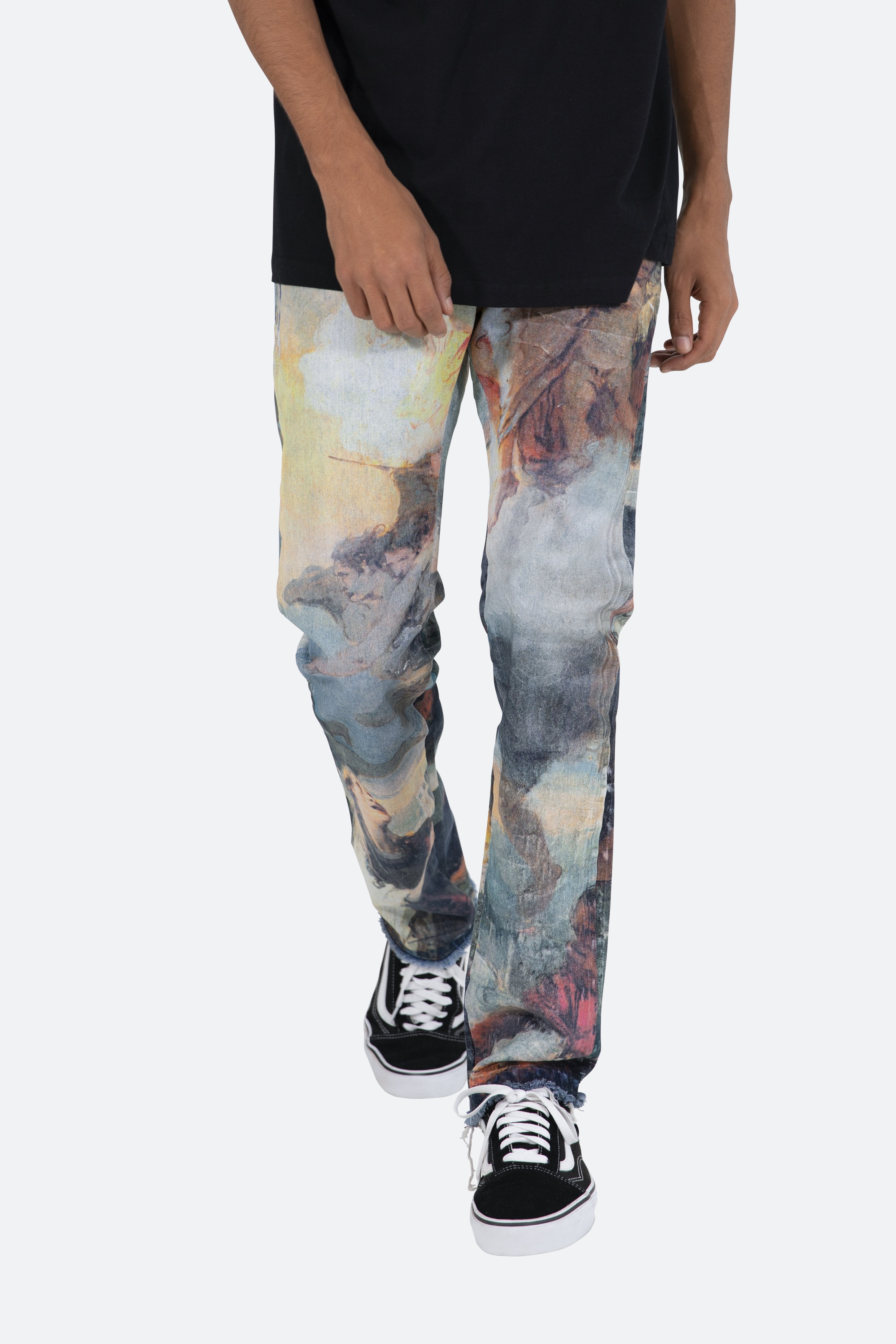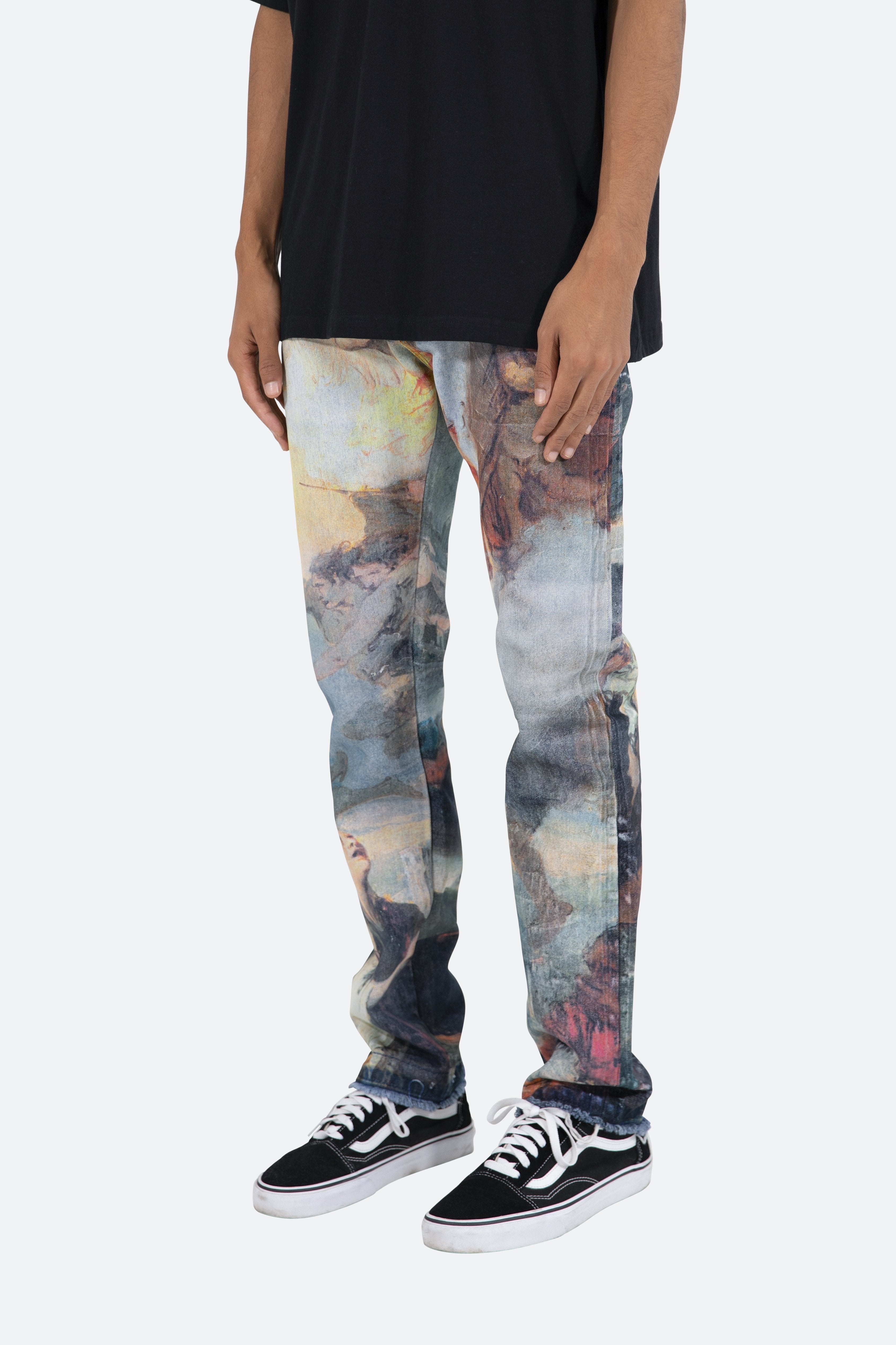 the D205 Overlay Denim is designed with our new D fit which is relaxed throughout with an extended inseam for stacking?and?features?a denim base that is?finished with?an all-over printed?classical painting artwork.